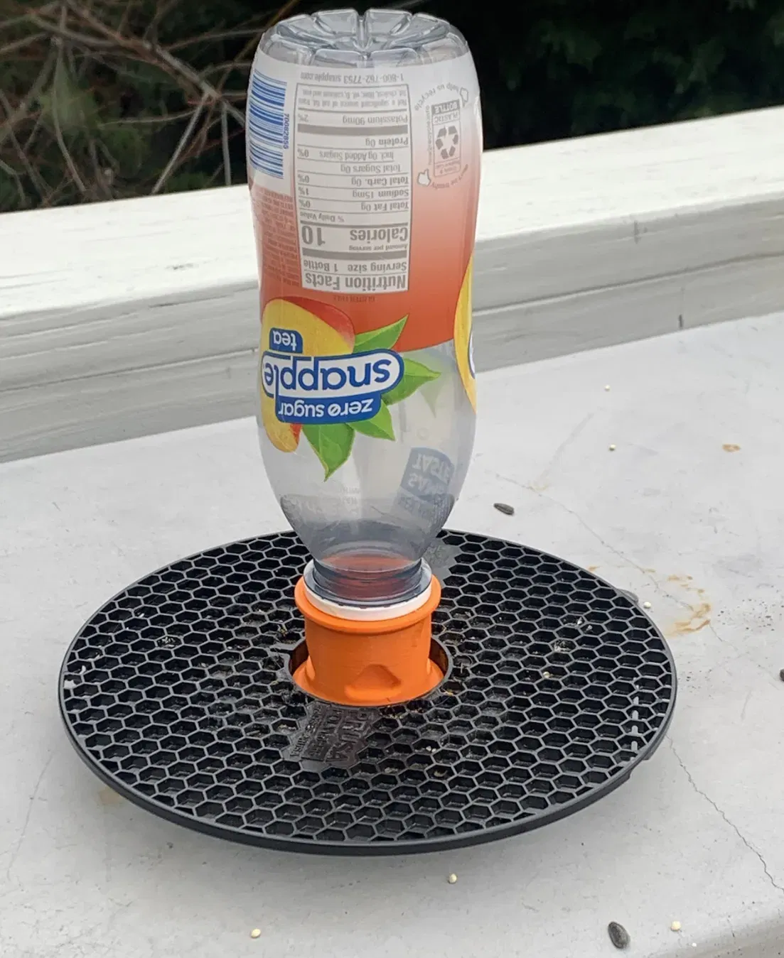 Đây là một cái máng ăn cho chim thực tiễn được xây dựng bằng cách sử dụng một flang cuộn Prusament và các chai nhựa tái chế — cả Snapple và Ocean Spray đều hoạt động. Phiên bản Snapple có thể vặn trực tiếp vào. Đối với chai Ocean Spray, tôi đã thêm một bộ chuyển đổi mới in bằng PolyFlex TPU95. Bạn sẽ cần khoan nắp chai gốc và lắp chặt nó vào nắp máng ăn TPU. Cái này không có ren, nhưng nó bám chặt.