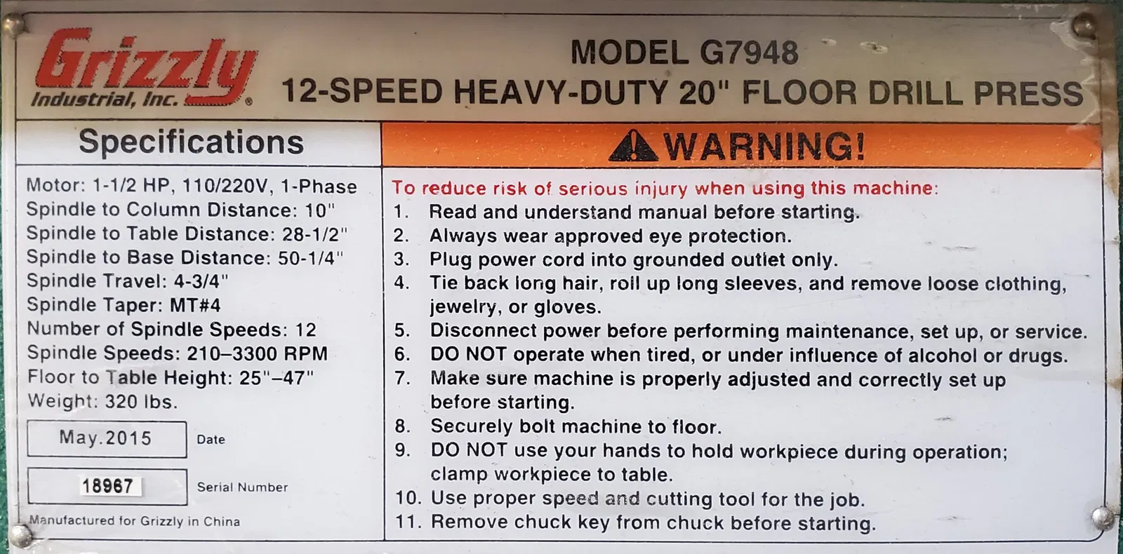 Đây là một bộ phận thay thế cho máy khoan đứng 20" nặng 12 tốc độ Grizzly, MẪU G7948.