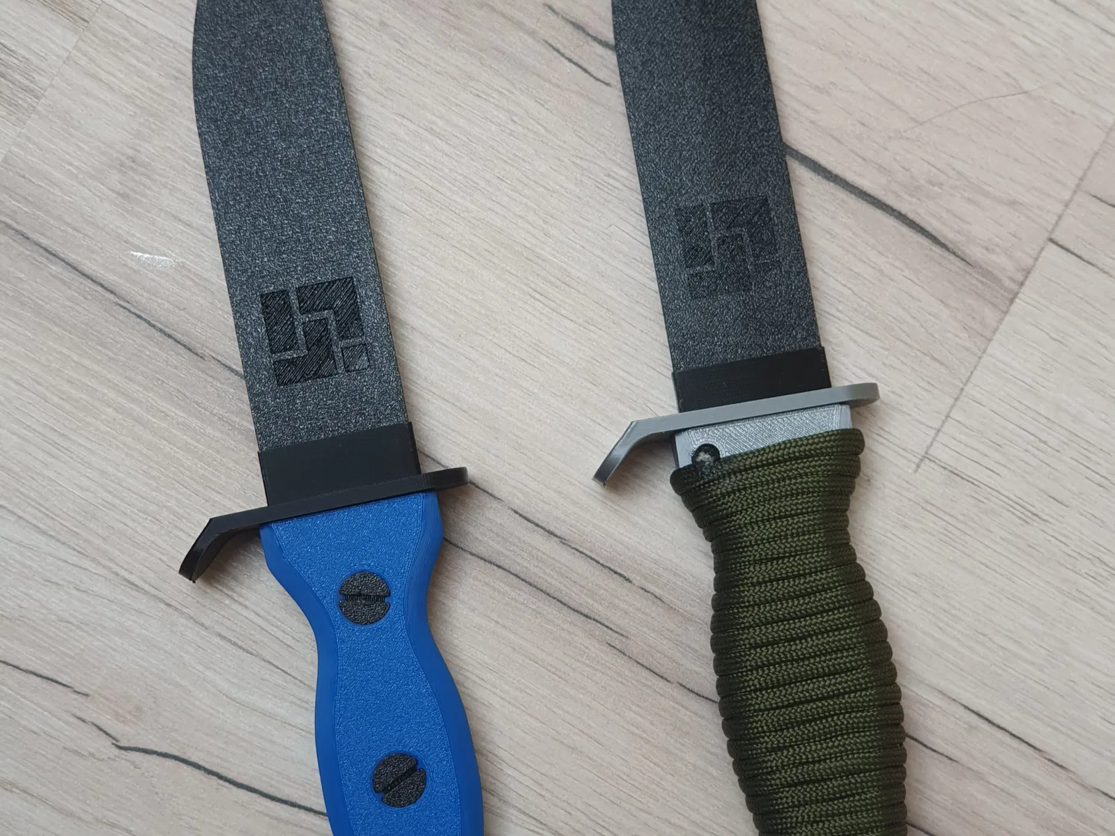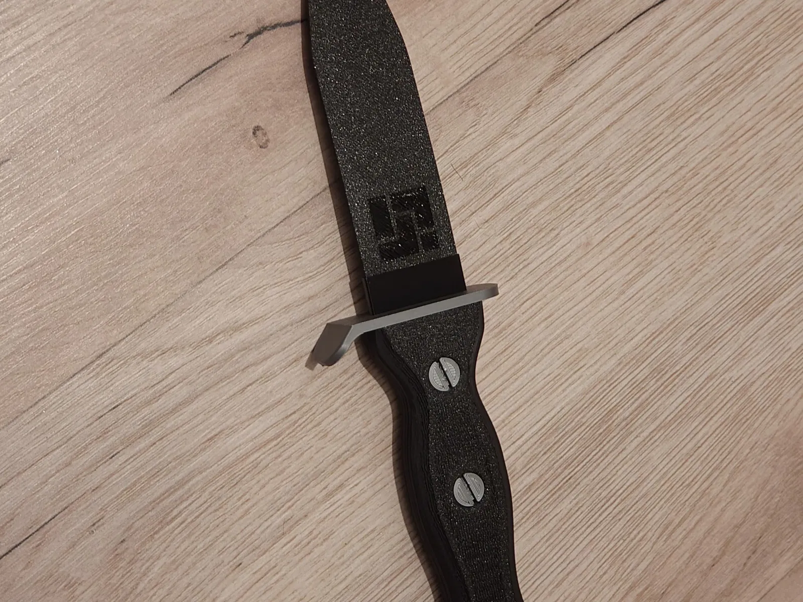 Đặt lưỡi dao vào giữa hai nửa của tay cầm. Vặn các ốc vít M6 đã in vào. Đưa bộ ổn định lưỡi dao qua tay cầm từ dưới lên. (Hoặc tải xuống “Tay cầm KHÔNG CÓ ỔN ĐỊNH” nếu bạn không muốn sử dụng bộ ổn định) Cẩn thận trượt tay cầm dọc theo lưỡi dao cho đến khi nó khớp vào tay cầm. Nếu bạn không muốn tháo rời con dao nữa, hãy cho keo vào chỗ lắp của tay cầm để khóa tay cầm vĩnh viễn.