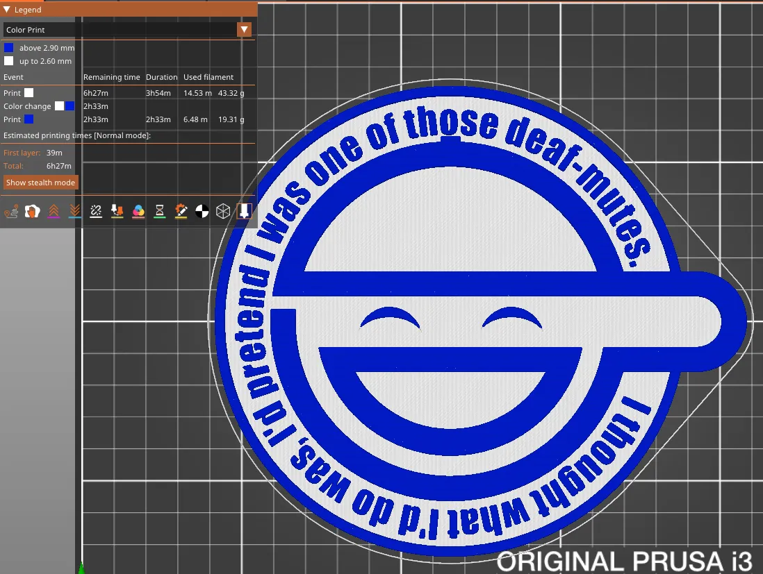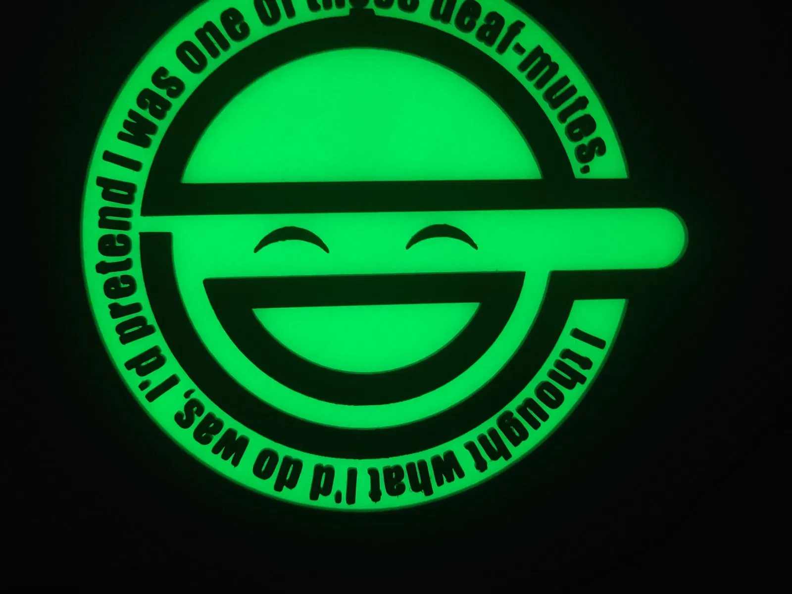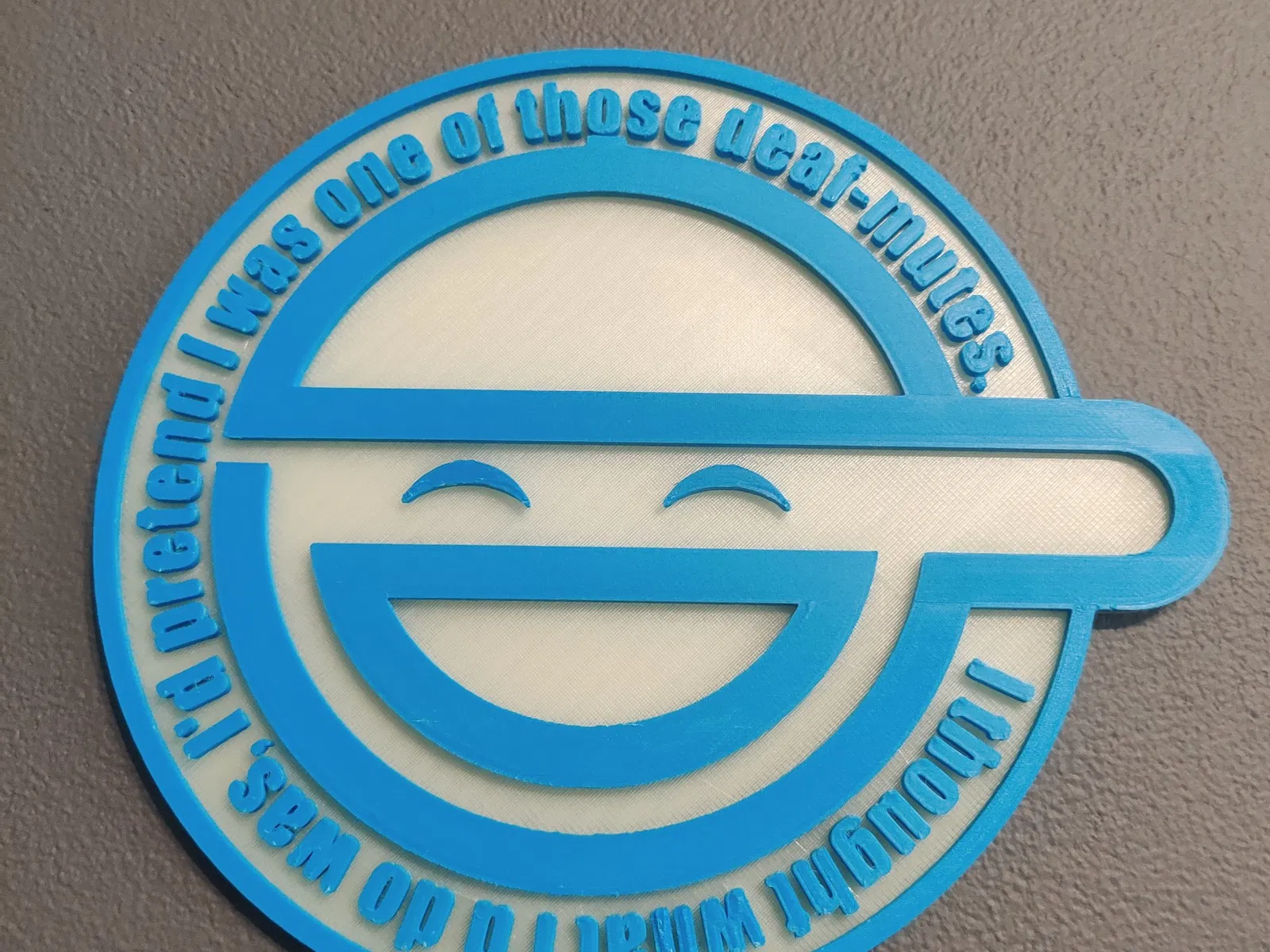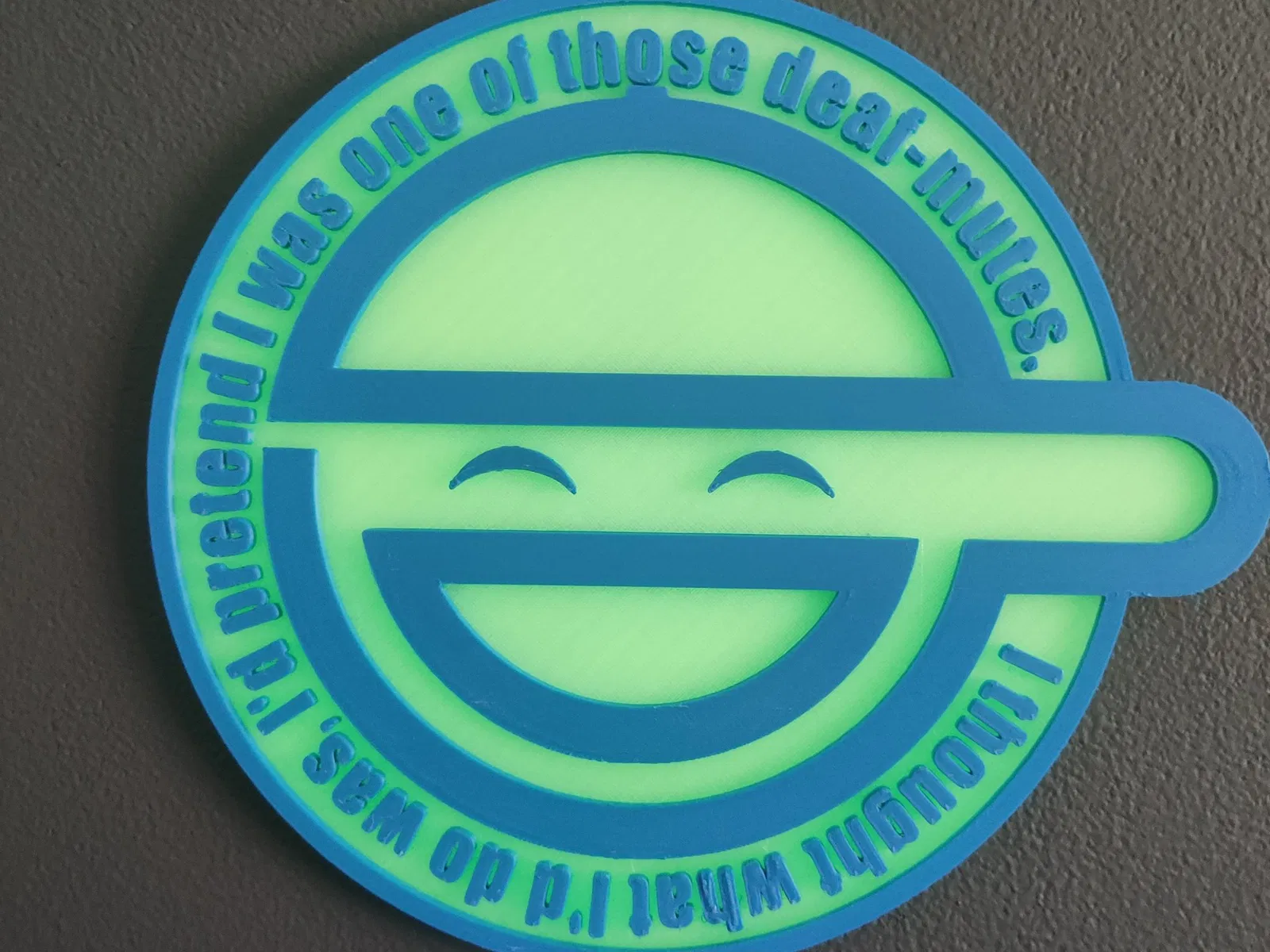 Một tấm ốp tường của logo Người Cười, như đã xuất hiện trong Ghost in the Shell: Stand Alone Complex. In bằng vòi phun 0.4, đáy sử dụng một loại filament PLA phát quang để tạo hiệu ứng phát sáng trong bóng tối.