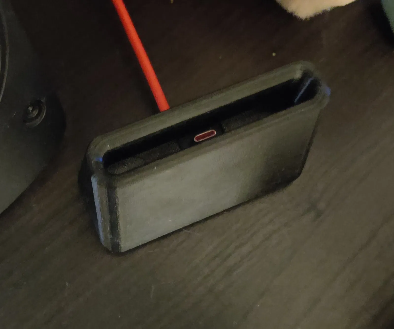 Giá đỡ dọc cho OnePlus 8 với một ống dẫn cho cáp nguồn màu đỏ. Khi cắm vào, điện thoại bắt đầu sạc.