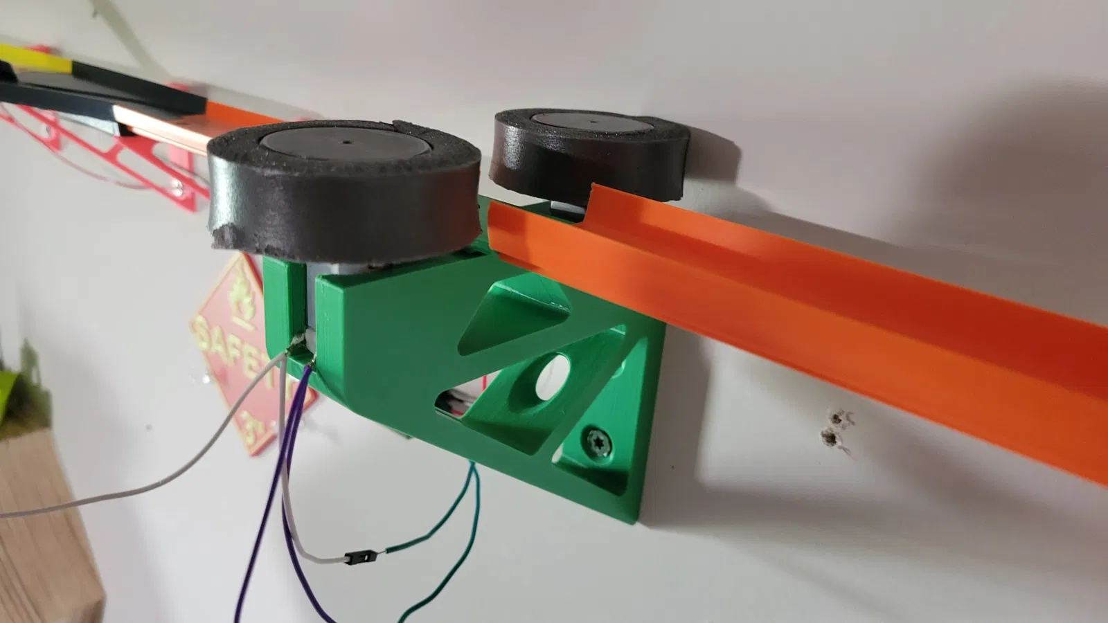 Một phần của hệ sinh thái theo dõi tường của tôi. Sử dụng 2 động cơ và bộ điều khiển tốc độ làm bộ tăng tốc tương thích với các bản nhạc Hot Wheels.