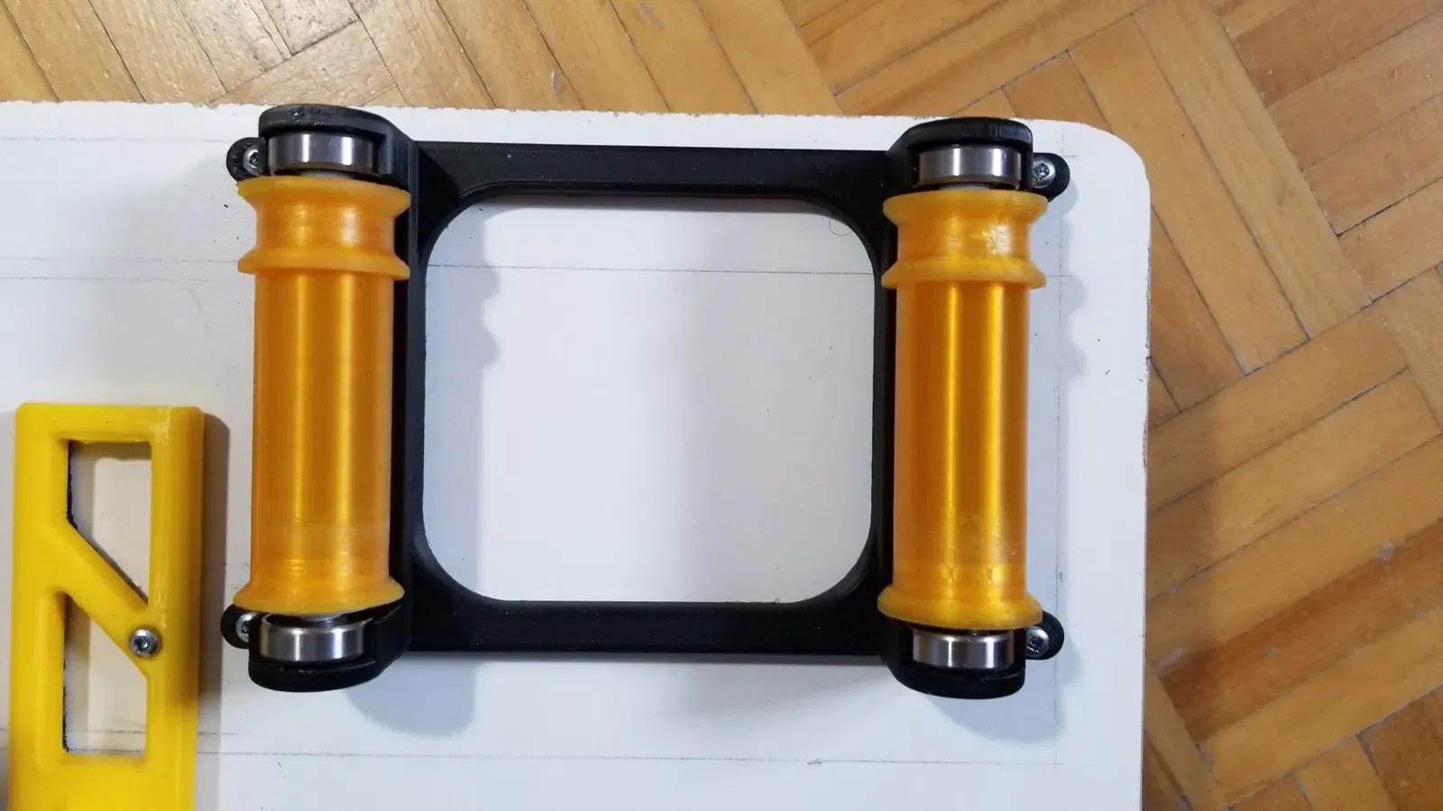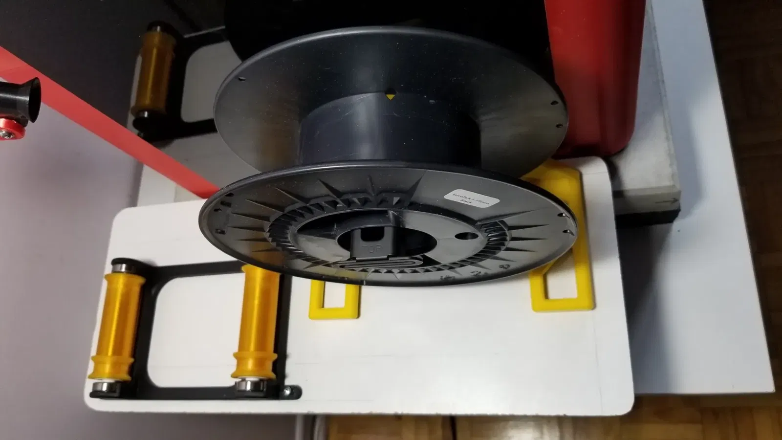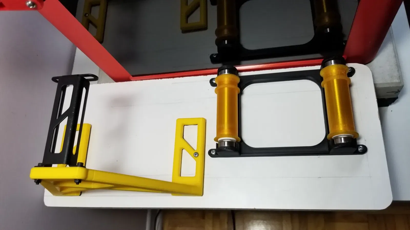 Đã thêm một chân đế rộng hơn 10mm và con lăn (92mm). Đây là một con lăn cuộn đôi dựa trên những ý tưởng trước đây của nhiều con lăn đơn. Cái này sử dụng con lăn với hai cạnh ở một bên để giữ cho cuộn không di chuyển xung quanh. Điều tốt với các con lăn đơn là chúng có ma sát rất ít, đến nỗi đôi khi cuộn của bạn có thể tạo ra những vòng lỏng lẻo thực sự có thể dẫn đến tắc nghẽn (đã xảy ra một lần). Vì vậy, một con lăn đôi cung cấp một chút kháng cự để ngăn điều này, nhưng khi cuộn gần hết và trở nên rất nhẹ, nó có xu hướng rơi khỏi bàn (cũng đã xảy ra vài lần). Mặt khác, giá đỡ cuộn không có vòng bi tạo ra nhiều ma sát khi cuộn đầy (nặng), nhưng giữ cho các cuộn nhẹ không bị rơi. Vì vậy, đối với tôi, điều tốt nhất của cả hai thế giới là có cả hai, và sử dụng logic khi nào để sử dụng cái này hay cái kia. Nếu đó là một bản in rất dài sẽ dẫn đến cuối cuộn, và tôi không ở đó để kiểm tra, tôi sẽ chọn cái không có vòng bi. 😊
