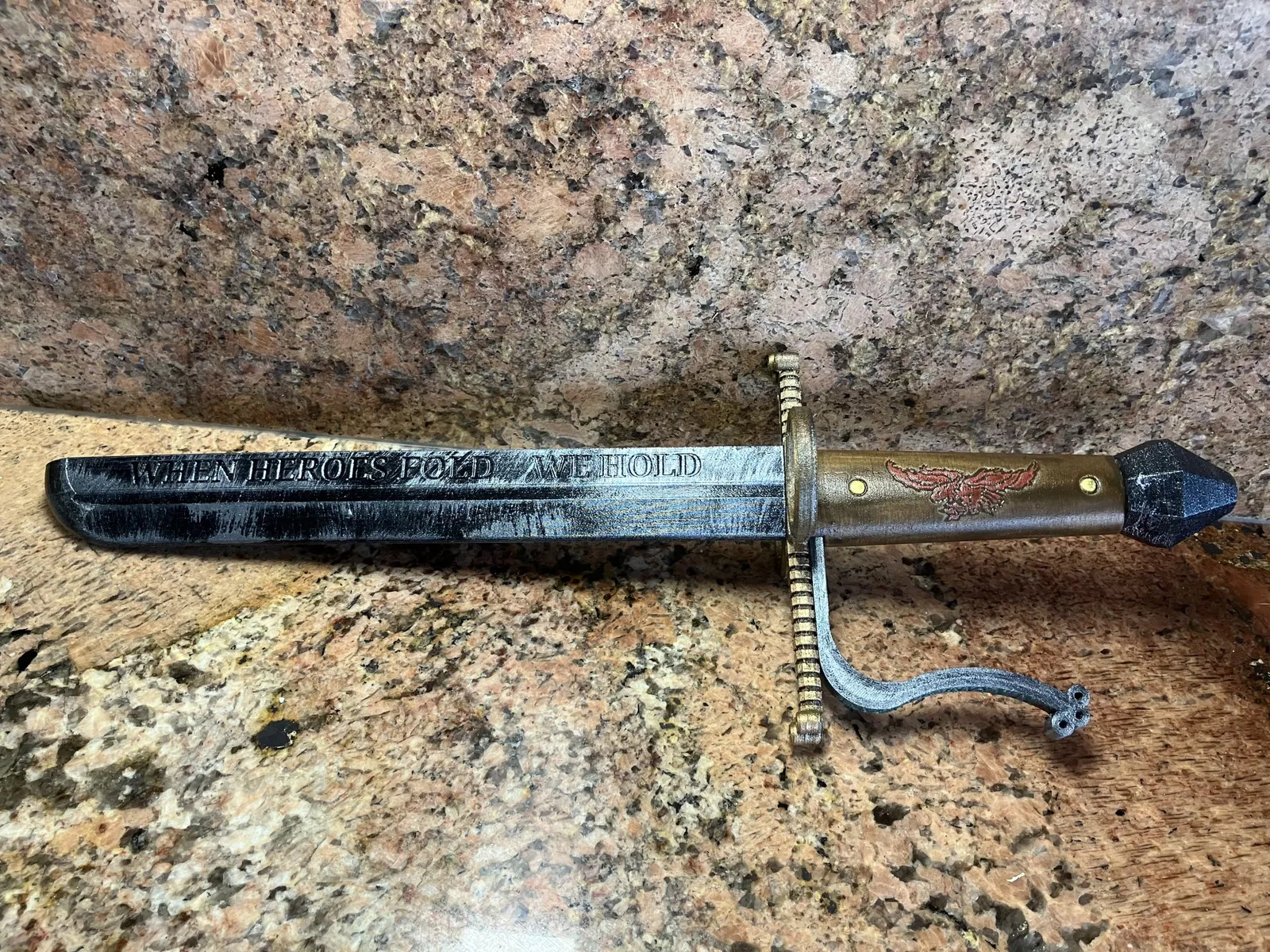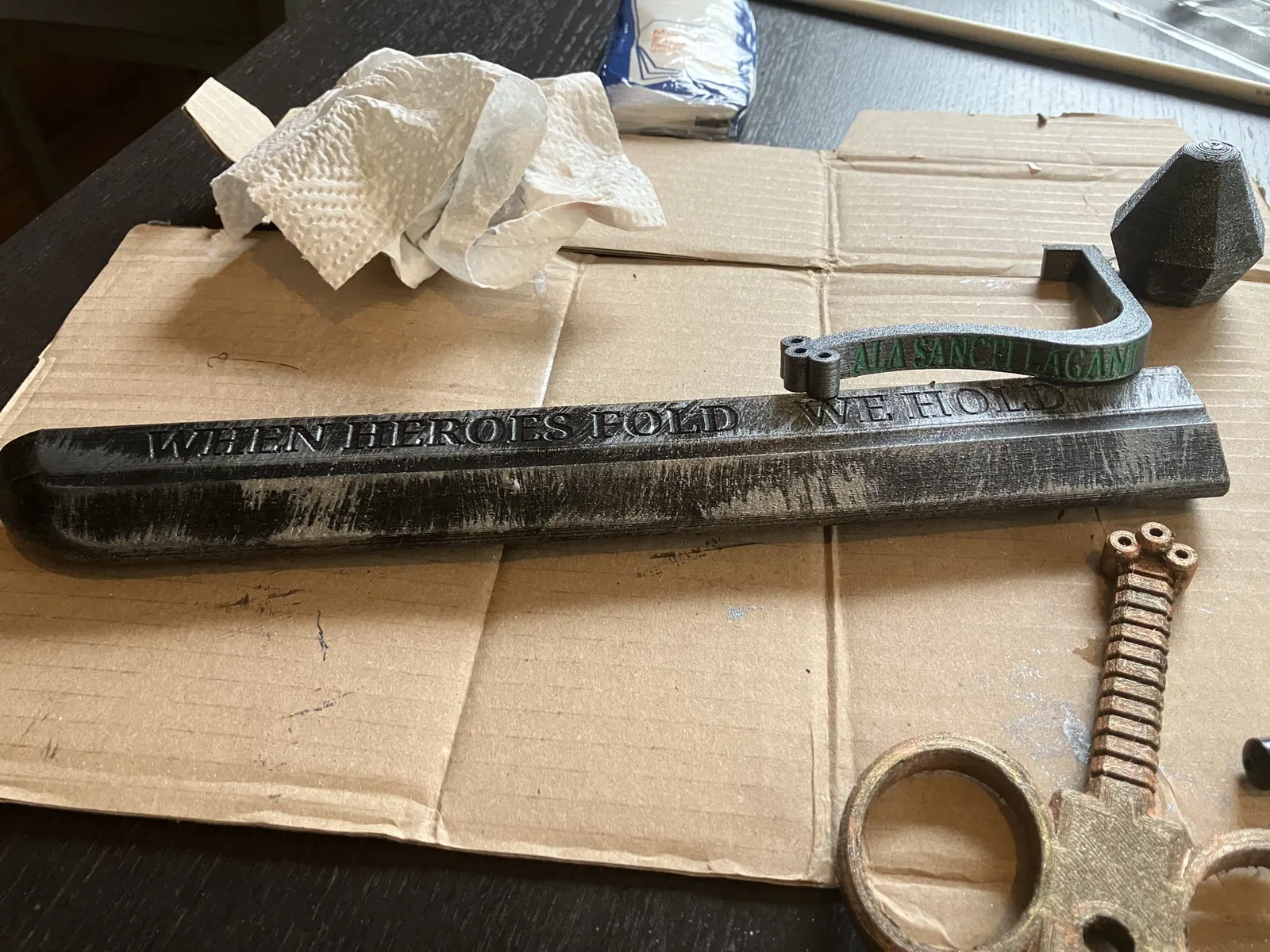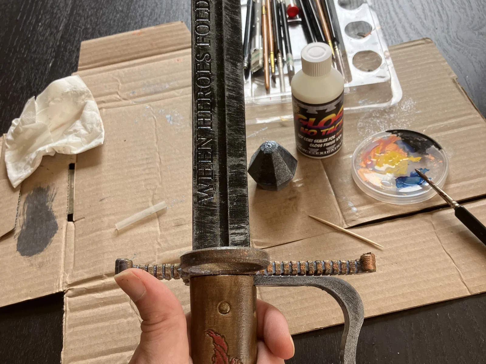 Làm sạch tất cả các bộ phận in, vâng bạn có thể sử dụng giấy nhám mềm và kềm cắt để loại bỏ các hiện vật in không mong muốn trên các bộ phận TPU 60A. Sử dụng dũa, dao cắt, giấy nhám, v.v. để làm sạch TPU 98A, chà nhám gỗ để có vẻ ngoài tốt hơn khi nhuộm/đánh bóng. Sau đó, sơn tất cả các bộ phận theo ý thích của bạn, đánh bóng các bộ phận TPU bằng chất trám bóng flexipaint (tất cả các lựa chọn thay thế cho đến nay đều cực kỳ độc hại nên hãy làm cho mình một ân huệ và lấy cái này). Tôi thấy việc đánh bóng dễ nhất bằng cách dán tất cả các bộ phận TPU ngoại trừ phần pommel lên lõi sợi thủy tinh và giữ chúng như vậy. Tôi đã sử dụng một loại sơn gỗ tối màu để tô màu cho tay cầm của mình, hoàn thiện với sơn vàng cho các móng giả.