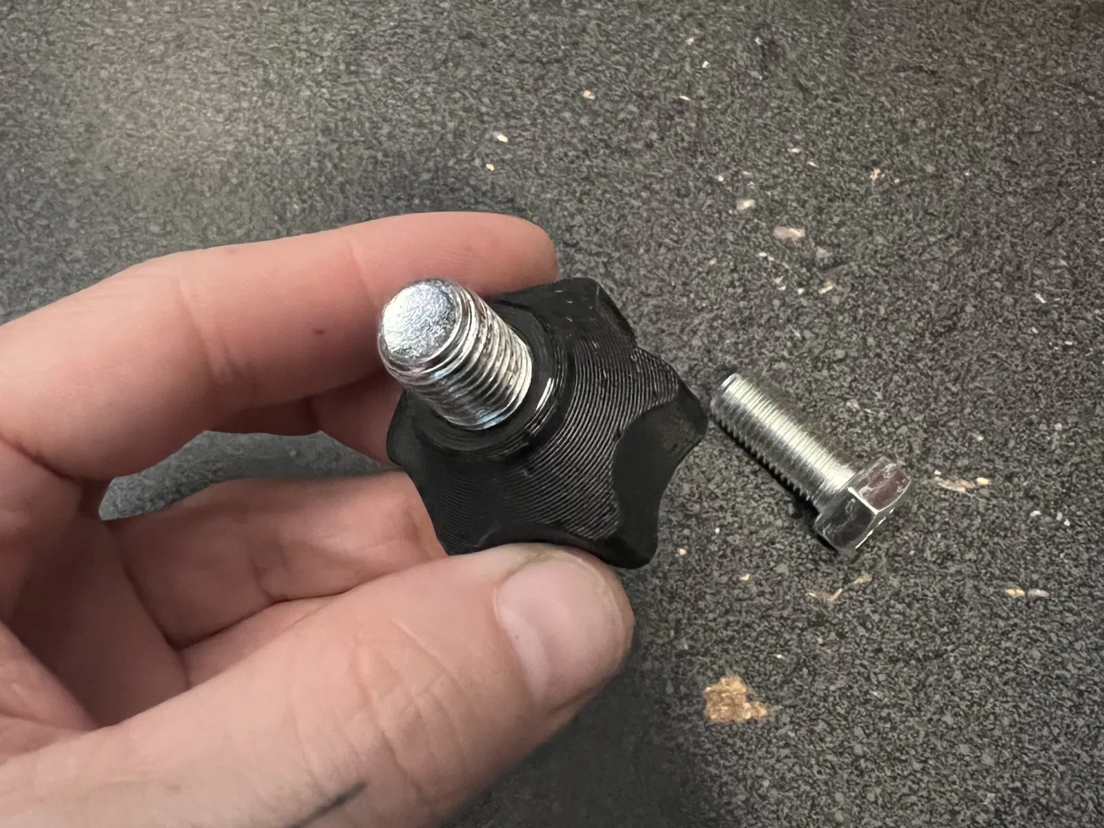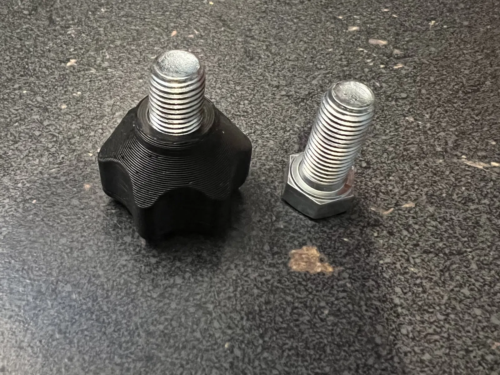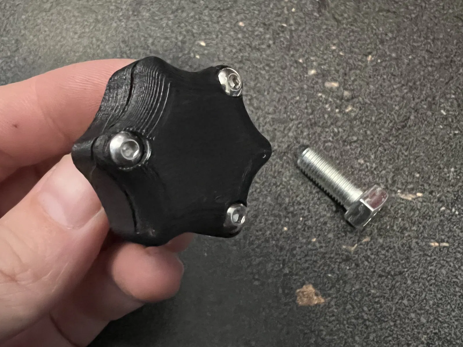 Đây là một núm cho một bu lông 7/16. Bạn chỉ cần trượt bu lông qua lỗ và cố định nắp bằng 3 ốc vít 3x8mm. KHÔNG siết quá chặt. các ốc vít tạo ra một ren khi bạn chèn chúng vào. Sự vừa vặn sẽ phụ thuộc vào máy in cụ thể của bạn. Nếu sự vừa vặn quá chặt, bạn có thể siết một đai ốc vào bu lông để kéo đầu bu lông vào trong ngăn đầu. Một tùy chọn khác là tăng kích thước lên một vài phần trăm cho đến khi bạn có được sự vừa vặn chính xác.