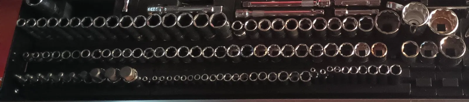 Một bộ tổ chức socket cho những ai có nhiều hơn một thương hiệu socket, hoặc các bản sao của cùng một kích thước socket, trong hộp công cụ của chúng ta! Hoạt động với bất kỳ kích thước socket nào có ổ cắm 1/4", 3/8" hoặc 1/2". Được thiết kế sao cho đáy của socket ngồi trực tiếp trên mặt ray và trượt tự do. Các núm được mô phỏng chính xác là các hình vuông 0.25", 0.375" và 0.5" (mỗi socket trong hộp công cụ của tôi đều lớn hơn một chút, vì vậy việc lắp vừa rất tốt).