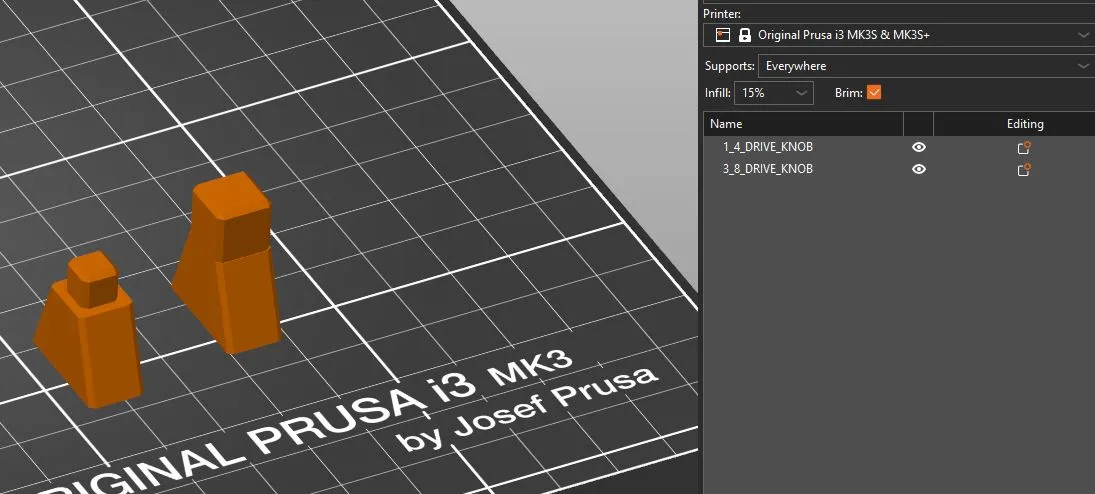 Mọi thứ đều có thể in mà không cần hỗ trợ, nhưng để có các lỗ nam châm sạch trên đáy ray, bạn sẽ cần hỗ trợ cho chúng. Núm ổ cắm 1/2" chỉ có thể in mà không cần hỗ trợ nếu bạn có phần trên của ổ cắm trên mặt bàn xây dựng như trong hình, các núm còn lại in với đáy lên.