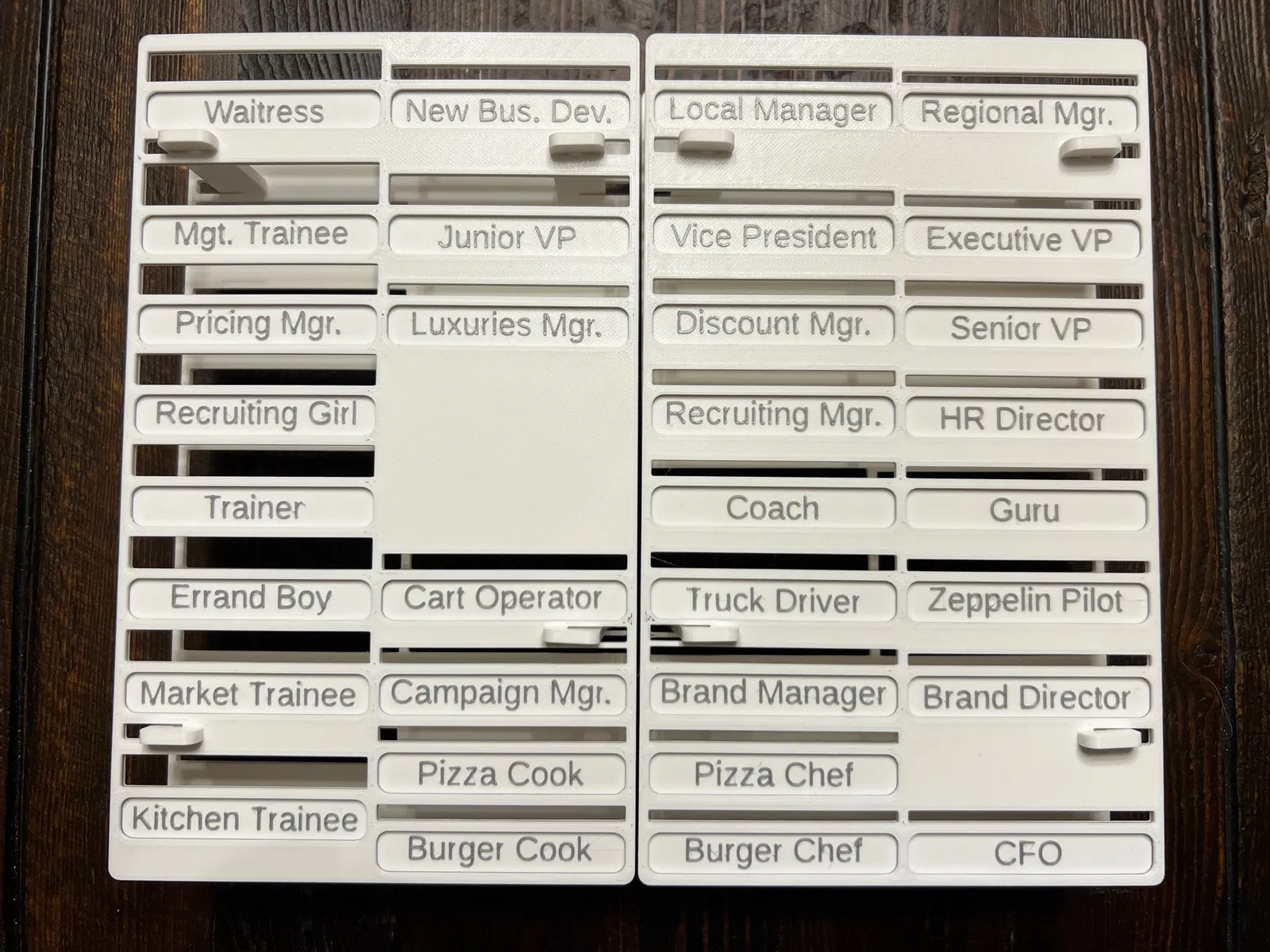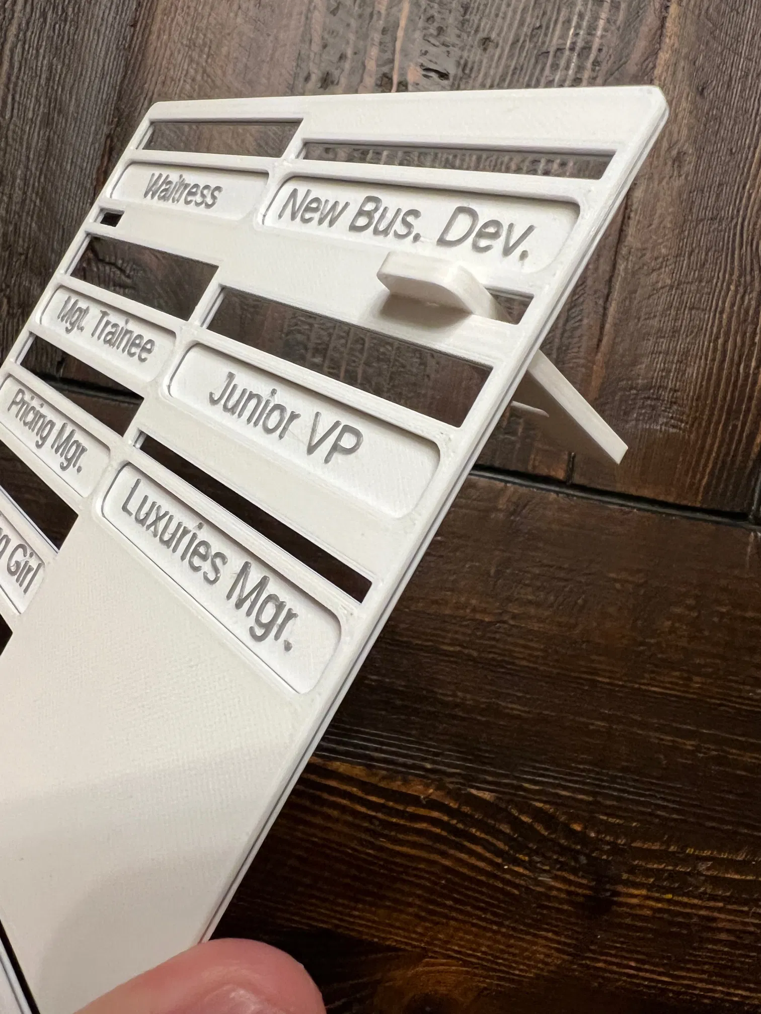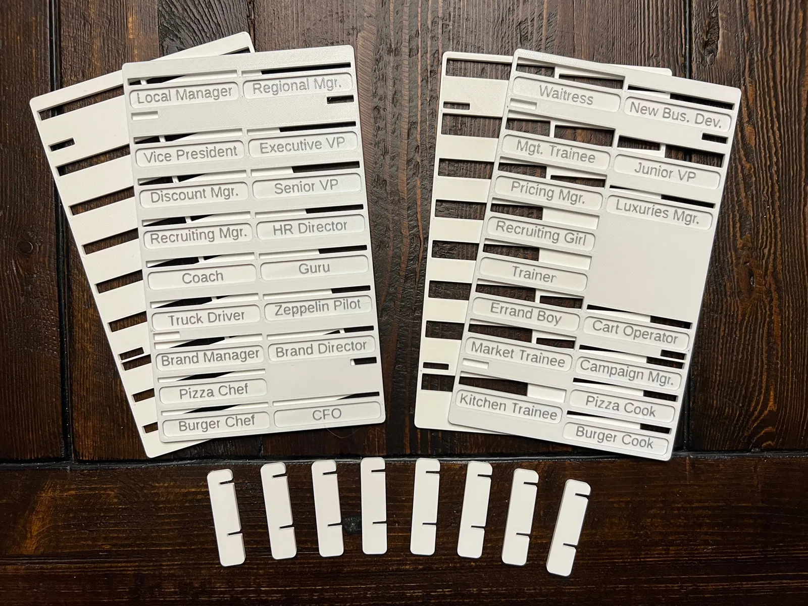 Để giải quyết vấn đề này, giá đỡ nhân viên trong bộ chèn này có hai tầng. Tầng trên cùng liệt kê tên của nhân viên. Tầng dưới có các lỗ lớn hơn một chút so với các lỗ trên khay trên cùng, vì vậy các thẻ có thể dễ dàng được đưa vào, nhưng chúng ngăn thẻ bị nghiêng hoặc trượt xuống dưới tầng trên cùng.