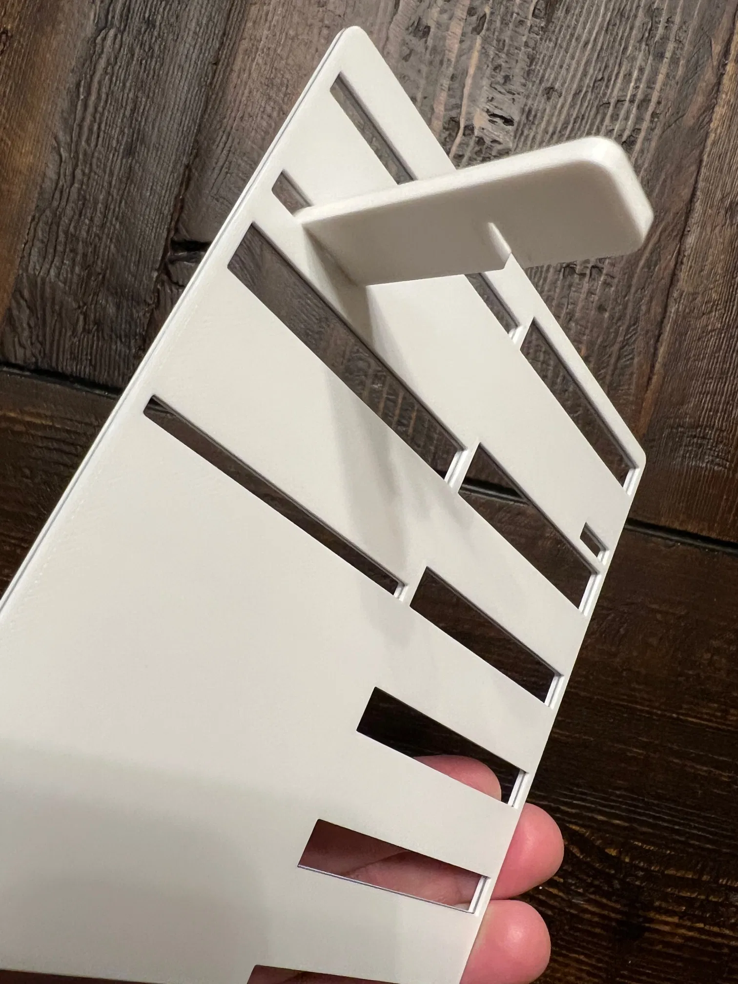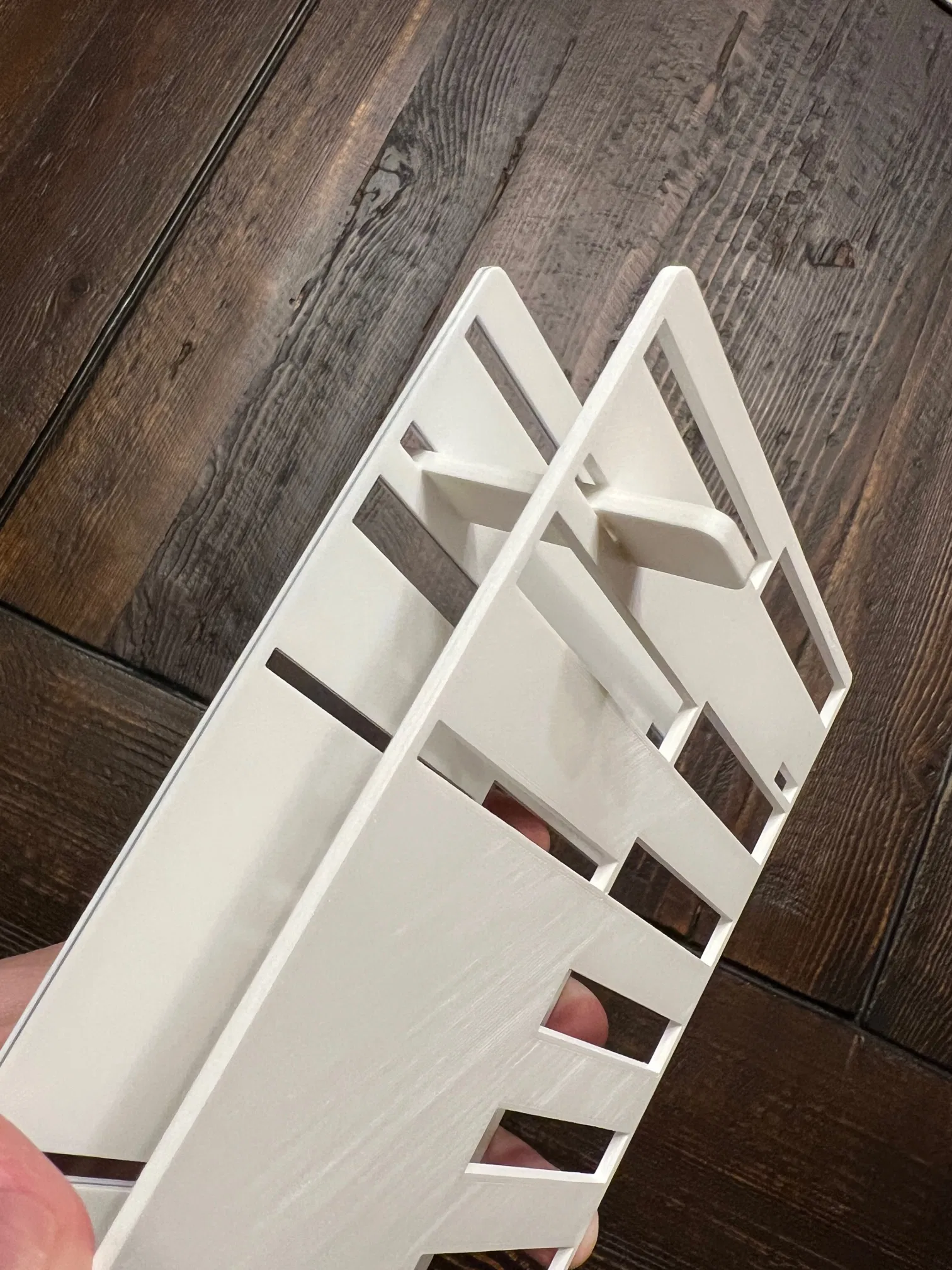 Để xây dựng giá đỡ nhân viên, bạn gắn một trong các kẹp được mô tả vào tầng trên cùng của giá đỡ nhân viên, trượt nó vào trong cho đến khi nó giữ chắc chắn. Nó vừa khít bằng lực ma sát, với kẹp có một khe nghiêng cho phép bạn đẩy cho đến khi kẹp chắc chắn, nhưng không hơn. Tôi khuyên bạn nên in các kẹp này với 100% độ đầy, chỉ để đảm bảo chúng càng chắc chắn càng tốt. Sau đó, bạn thêm tầng dưới vào kẹp đầu tiên và cố định nó vào khe dưới cùng trên kẹp đó. Sau đó, bạn thêm ba kẹp còn lại. Các ảnh cho thấy cách thực hiện từng bước này. Làm điều này với cả hai nửa của giá đỡ nhân viên, và bạn đã sẵn sàng để nạp thẻ!