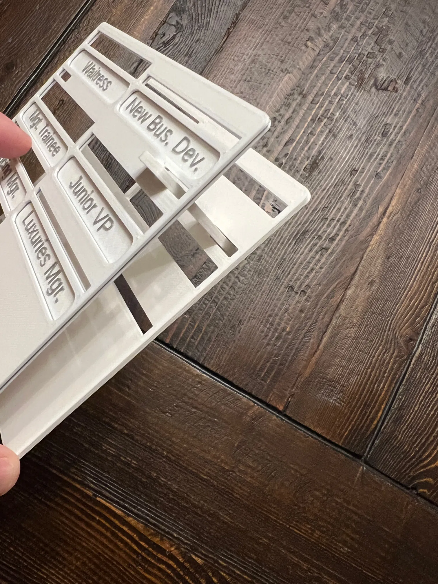 Để tạo hiệu ứng hai màu trên khay nhân viên được hiển thị trong ảnh, trong trình cắt lớp của tôi, tôi đã thiết lập thay đổi màu sợi đốt trên hai lớp tương ứng với văn bản xác định tên nhân viên. Trong PrusaSlicer, nếu bạn cắt mô hình trước, bạn có thể nhấp vào dấu + bên cạnh lớp bạn muốn thay đổi màu. Làm điều này trên lớp đầu tiên nơi văn bản xuất hiện, sau đó làm lại một vài lớp phía trên để chuyển lại về màu chính của bạn. Sử dụng kỹ thuật này, tôi đã in các tầng trên cùng của giá đỡ nhân viên bằng nền trắng, chữ xám/bạc và phần trên cùng màu trắng. Tôi tin rằng các trình cắt lớp khác có các tùy chọn tương tự. Nếu bạn có thiết lập đa màu đẹp mắt cho phép thay đổi màu trong một lớp, bạn cũng có thể thực hiện theo cách đó. Nhưng bạn vẫn có thể đọc văn bản ngay cả khi in tất cả bằng một màu.