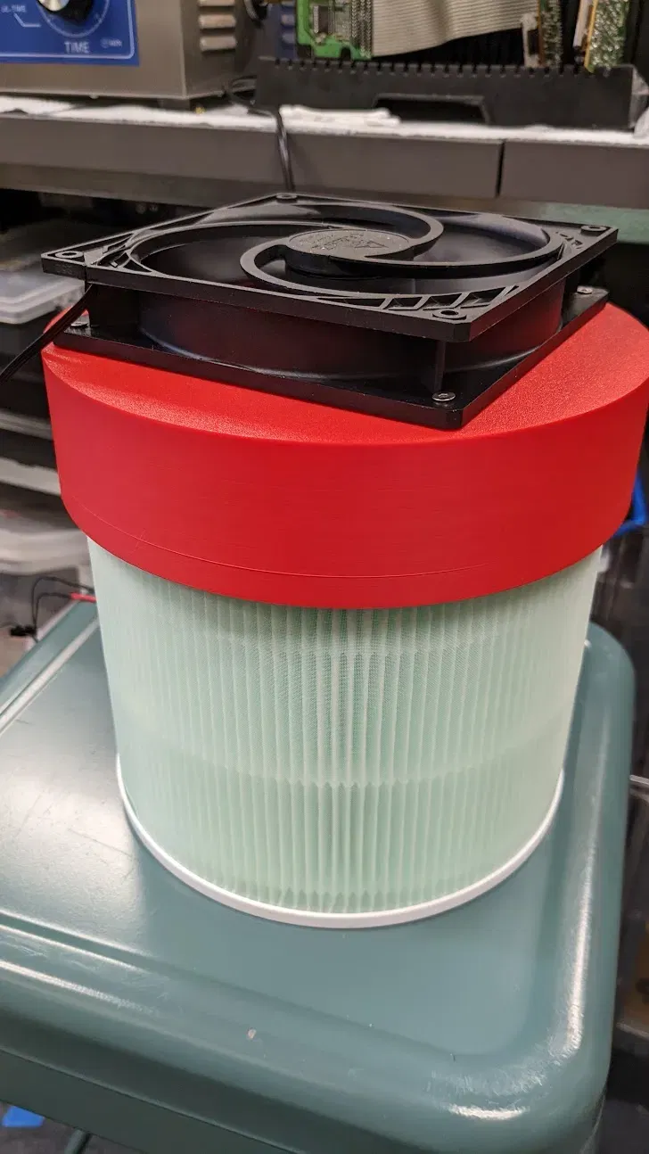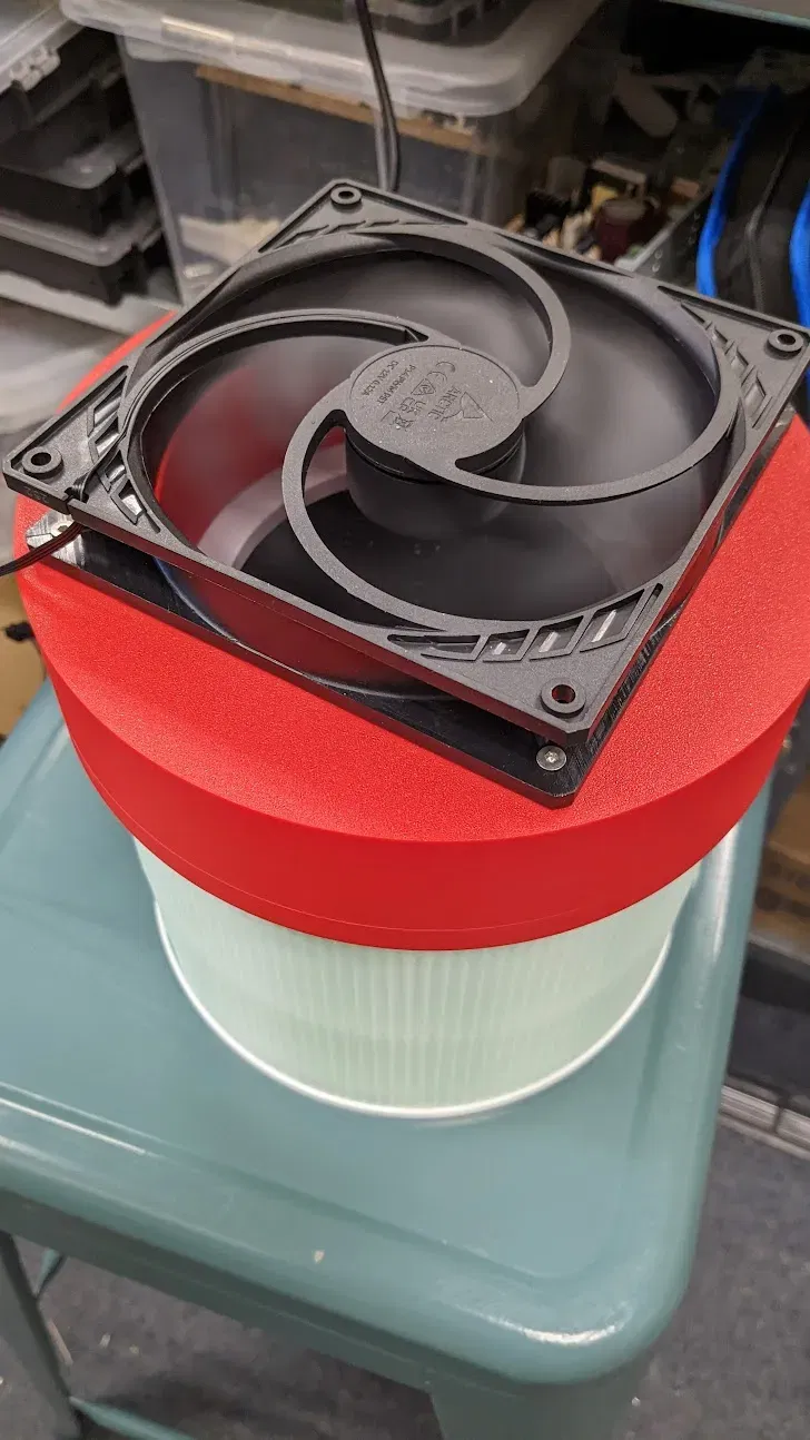 Phòng của tôi không có thông gió tốt và tôi phải chạy một quạt lớn 500cfm qua một ống dẫn đến một khe nhỏ ở cửa sổ duy nhất của xưởng của tôi, vì vậy tôi luôn tìm cách lọc không khí từ việc in ấn và đặc biệt là kể từ khi tôi bắt đầu in bằng nhựa resin. Tôi đã mua Levoit LV-H28 và nó hoạt động tốt, nhưng có một công tắc nguồn mềm khó chịu nên tôi có thể quên bật nó lên. Trong khi xem các mẫu lớn hơn của dòng 300, tôi thấy bộ lọc loại bỏ độc tố và quyết định mua cái đó và một quạt 140mm có áp suất tĩnh rất cao được thiết kế cho các bộ tản nhiệt. Cả hai đều đã đến từ Amazon và tôi nhanh chóng kiểm tra độ khít áp suất từ bộ phận in 3D đến bộ lọc và sau đó hoàn thiện giá đỡ quạt 140mm ở trên cùng. Bộ lọc có một miếng đệm bằng bọt nên với độ khít áp suất rất tốt, chỉ cần quạt cần một miếng gaskets nào đó để đảm bảo không khí được hút qua bộ lọc.