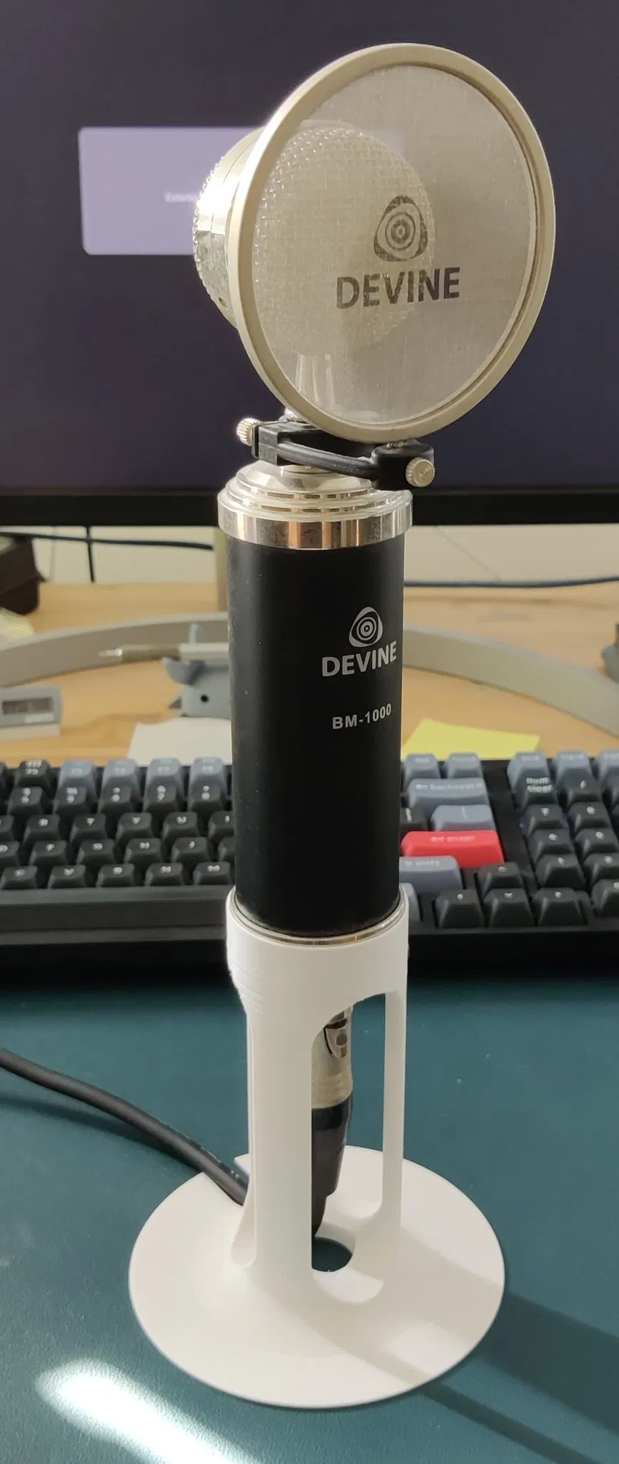 Một giá đỡ đơn giản mà tôi thiết kế cho micro condenser Devine BM-1000 của mình. Đây là một mẫu khá cao, nhưng điều đó là cần thiết để đưa kết nối XLR của cáp vào bên trong. Giá đỡ hoạt động rất tốt nếu bạn sử dụng micro cho các cuộc gọi video, hoặc nếu bạn muốn đặt nó trước một bộ khuếch đại mà không gặp rắc rối với một giá đỡ mic lớn hơn.