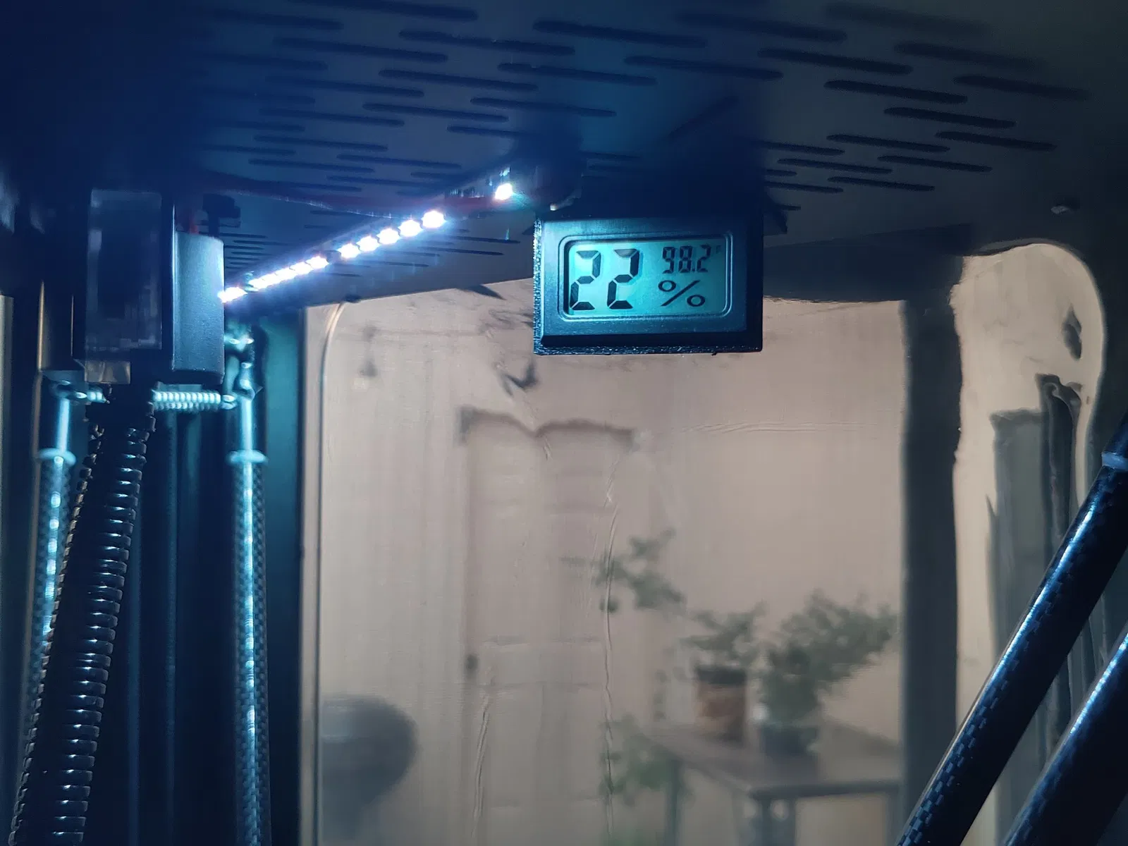 Tôi đã tạo ra giá đỡ cơ bản này để giữ một nhiệt kế trên trần của V400. Tôi quan tâm đến việc có thể theo dõi nhiệt độ và độ ẩm sau khi đóng kín máy in. Tôi đã để giá đỡ mở để cho phép những nhiệt kế độ ẩm rẻ tiền này có thể chính xác nhất có thể. Ví dụ này được in bằng PETG, nhưng PLA sẽ ổn vì nhiệt độ không bao giờ vượt quá 120F.