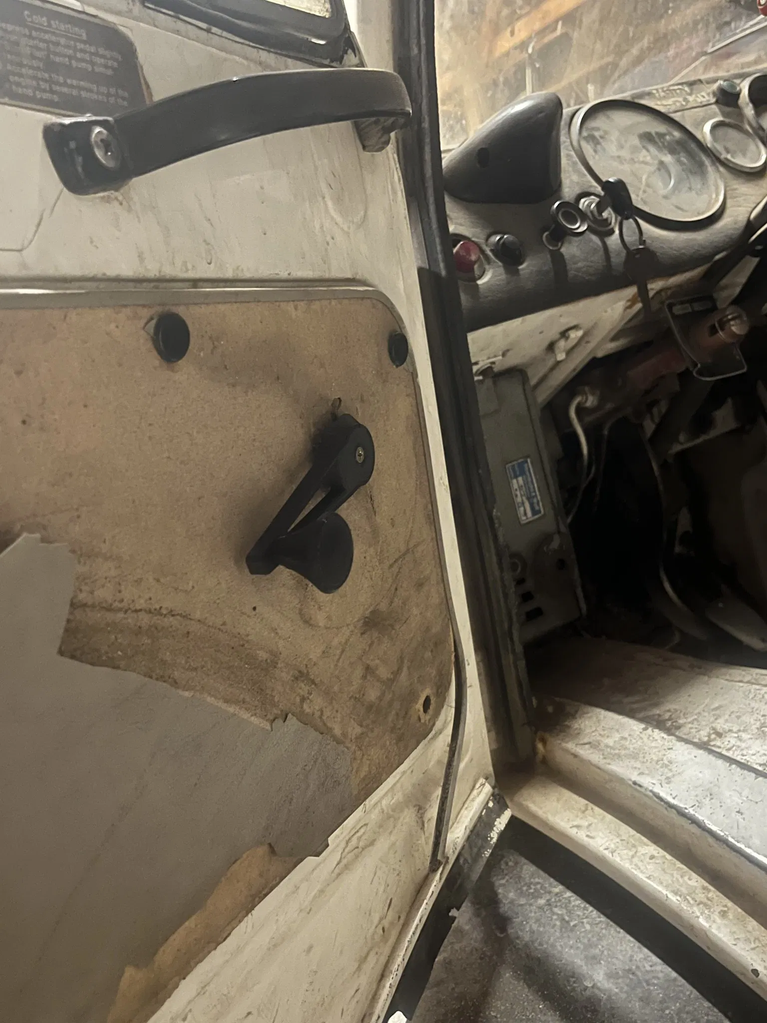 Đây là một tay cầm cho cửa sổ trong một chiếc Mercedes Unimog năm 1974.