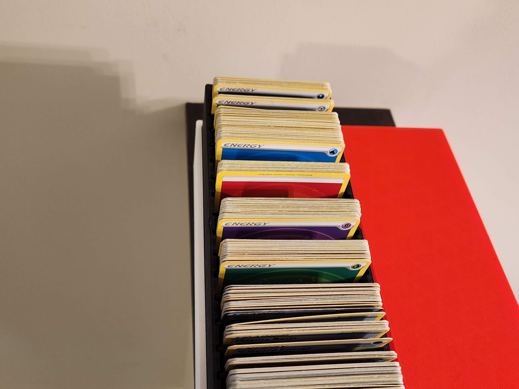 Một hộp lưu trữ lớn cho thẻ Pokemon. Có các khe chia cách mỗi 10mm để giữ cho các thẻ được tổ chức. Các khe không đi xuống tận đáy để giúp ngăn ngừa việc thẻ bị kẹp hoặc cong. Đặt một khe chia ở gần giữa giúp nắp đậy khít hơn một chút.