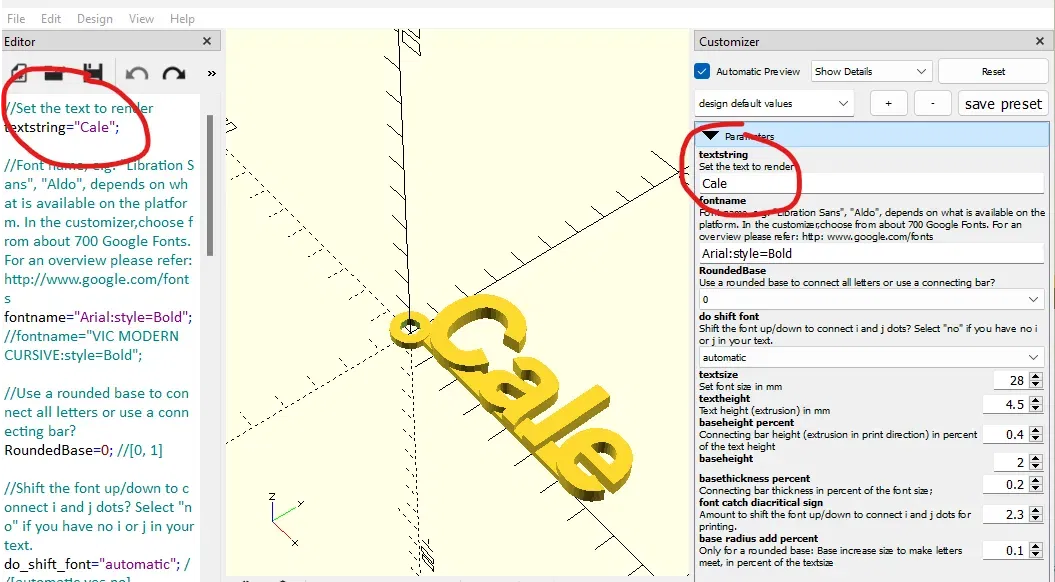Mã thẻ khóa/thẻ tên tùy chỉnh này sẽ cho phép bạn nhập bất kỳ tên nào bạn thích để tạo một tệp STL. Tất cả các chữ cái đều được liên kết và một điểm kết nối được tạo ra cho bạn. Tôi sử dụng filament TPU và gắn bất kỳ số lượng kết nối nào như vòng tách để gắn thẻ tên này vào chìa khóa, túi, kệ, chó, v. v. Bạn có thể gán nhãn bất cứ thứ gì bạn muốn thực sự. Open SCAD có thể tải xuống miễn phí để cài đặt và sử dụng. Tất cả những gì bạn cần làm là thay đổi tên ở đầu văn bản bên trái, hoặc trong trường tham số bên phải và sau đó nhấn F6 và nhấp vào nút STL để tải tệp STL về. Bạn có thể sửa đổi mã để tạo bất kỳ loại kết nối nào phù hợp, chẳng hạn như cái trong hình ảnh mà tôi đã gắn một móc snap xoay.