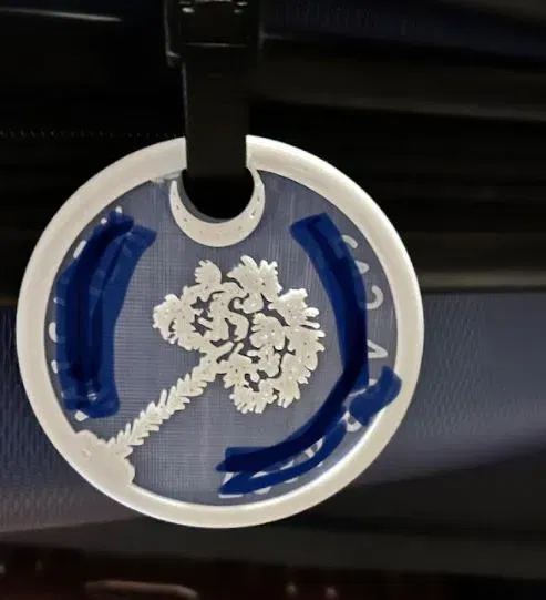 Tôi đã sử dụng một tệp SVG, chỉnh sửa nó trong Illustrator sau đó tạo thẻ hành lý trong Tinkercad. Có thể tùy chỉnh để thay đổi màu sắc ở các độ cao khác nhau.