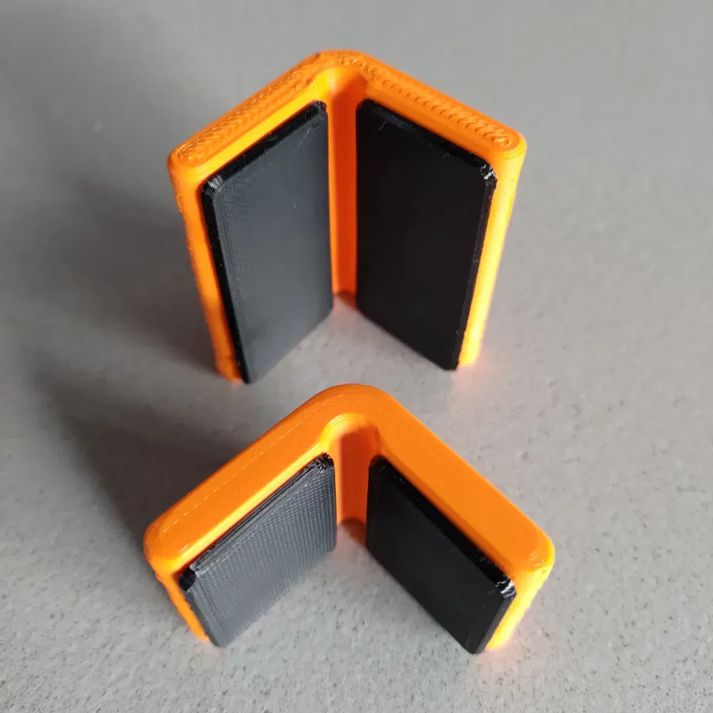 Tôi đã in các góc bằng PLA với 100% độ đặc, vì vậy nó là một mảnh nhựa rắn. Các bộ bảo vệ được in bằng TPU và sẽ vừa vặn trong phần ngoài đã in.