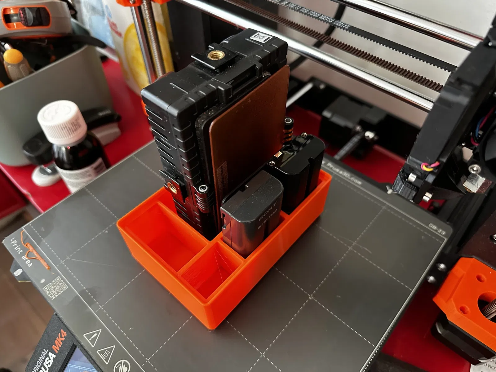 Một hộp Gridfinity 2x3 cho Cameralight DV96-V Falconeyes DV96-V, hai pin V-mount và hai không gian lưu trữ bổ sung.