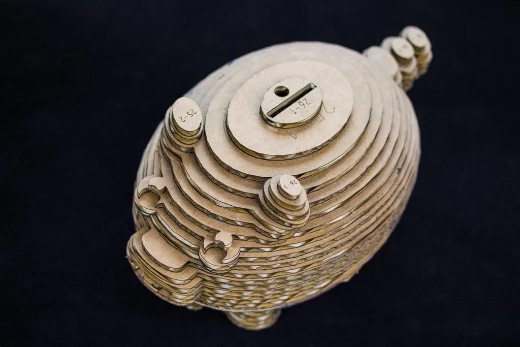 PiggyThick.stl CŨNG có thể được in 3D, mặc dù anh ấy có nhiều thịt hơn. Tệp này phù hợp hơn cho việc nhập vào Fusion 360 của Autodesk để chuẩn bị cho việc cắt bằng máy laser. Piggy.3dmk được tạo ra bằng cách sử dụng PiggyThick, cũng như kế hoạch cắt trong Piggy.pdf và Piggy.svg, giả định kích thước nguyên liệu là 12in X 20in. Phiên bản đã cắt của tôi về Orville được xây dựng từ các hộp vận chuyển Amazon đã qua sử dụng được dán lại với nhau bằng keo của Arleen.