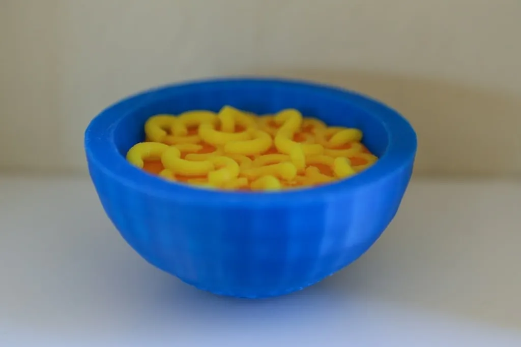 Thiết kế Mac & Cheese này có thể được in với một màu. Nhưng bạn cũng có thể thêm một chút hương vị bằng cách in bát và nội dung bằng các màu khác nhau. Nếu bạn thực sự muốn có một món ngon thì hãy in mì và phô mai bằng hai màu trên máy in Prusa XL với hai đầu in.