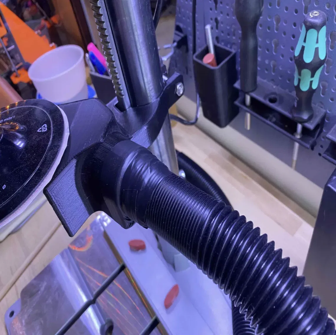 Tôi có một xưởng rất nhỏ, vì vậy tôi phải sáng tạo với các công cụ của mình. Tôi đang sử dụng máy khoan đứng như một máy chà nhám quay và cần một cách để nhanh chóng gắn hệ thống thu bụi. Nó hoạt động hoàn hảo! Nếu bạn muốn thiết lập giống như vậy, chỉ cần mua đệm chà nhám với velcro cho máy khoan và bạn đã sẵn sàng.