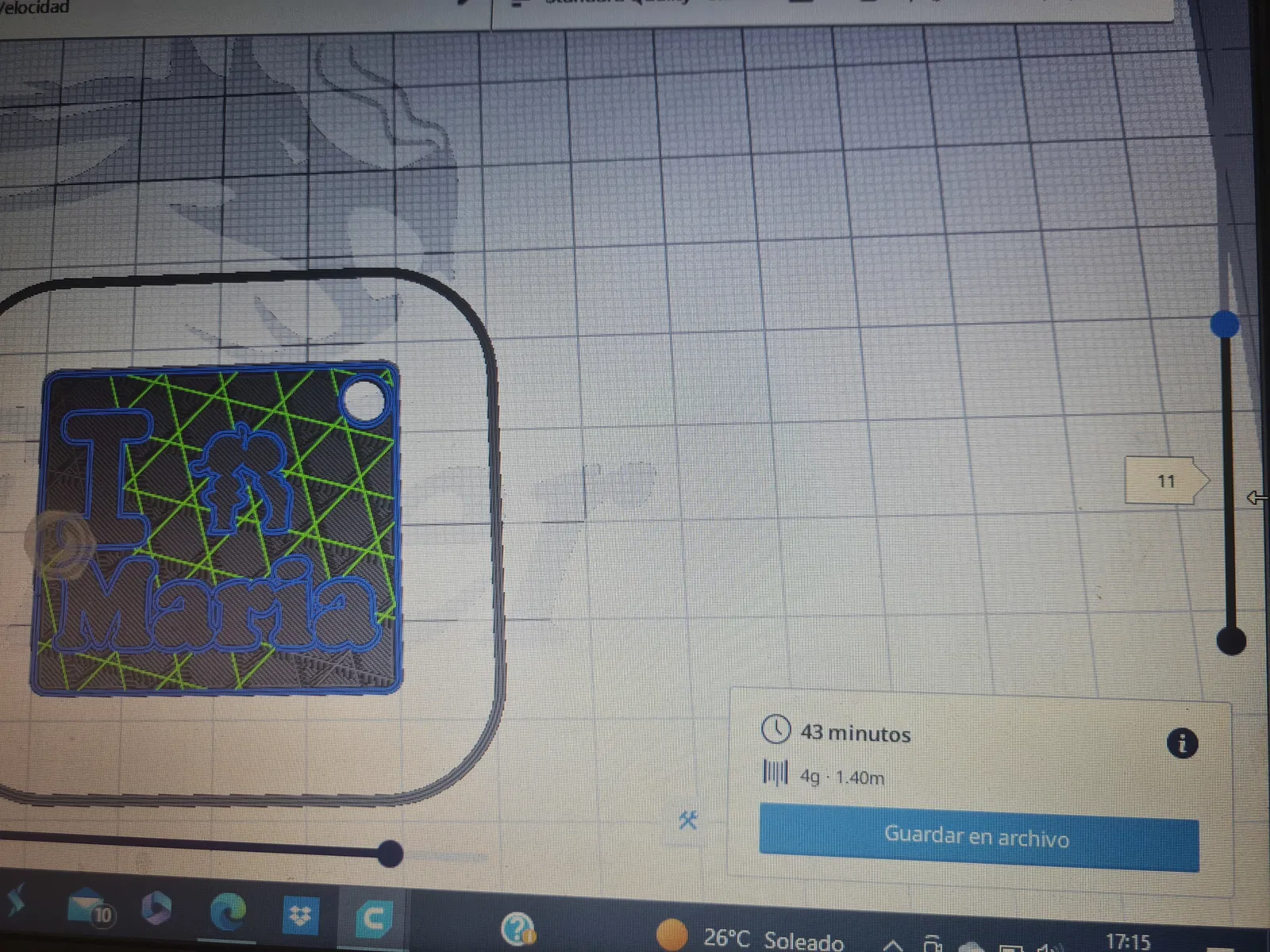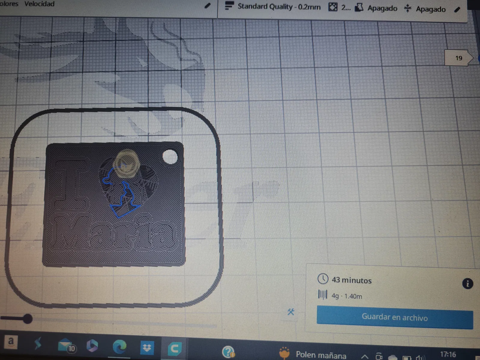 Xoay nó 180 độ vì khi đổi màu có thể làm lem lớp dưới. Rỗng ruột 15% Đầu phun 0.4 Độ dày lớp 0.2 Tốc độ 30mm/s