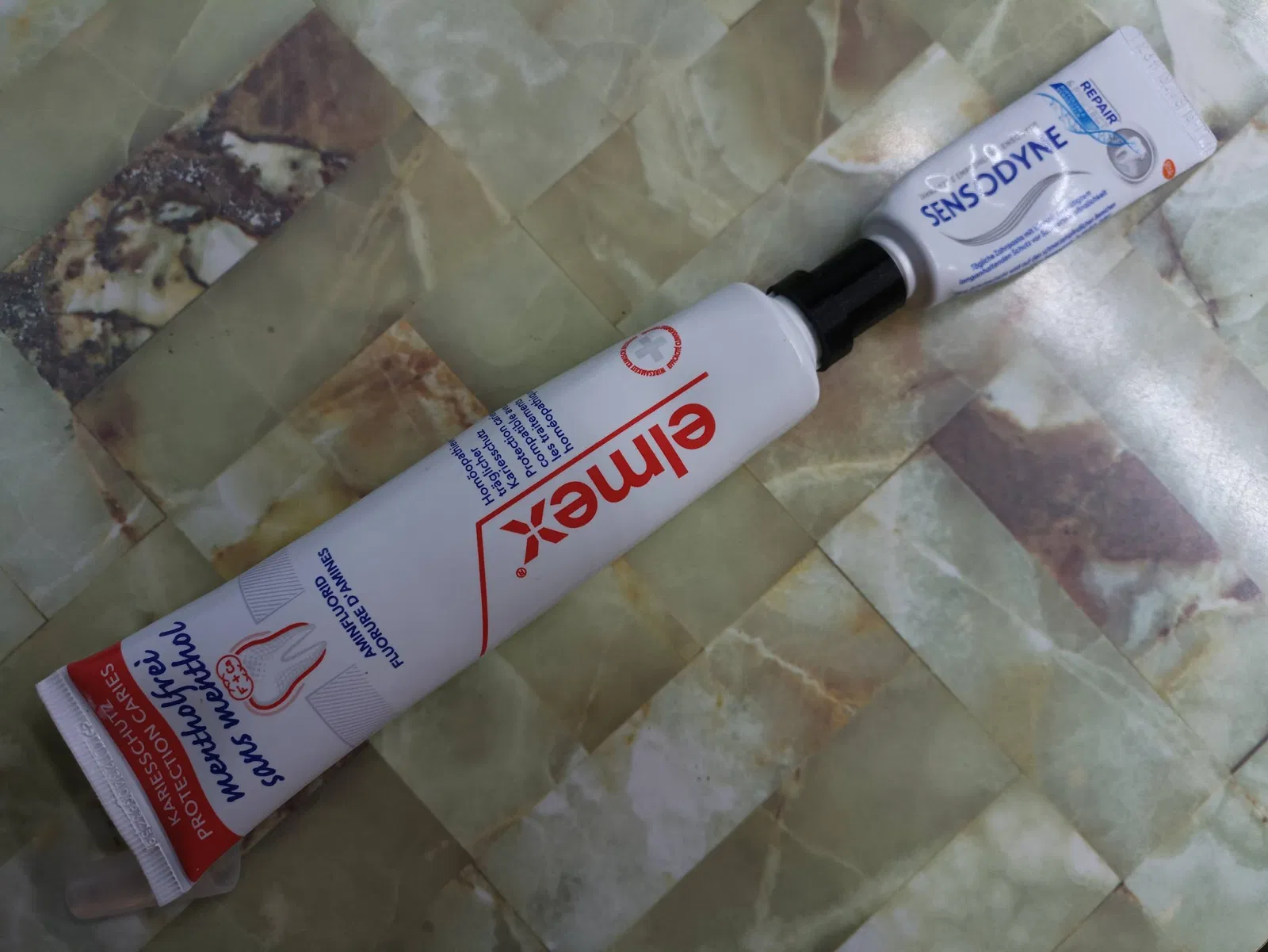 Đây là một ống chuyển kem đánh răng từ ELMEX bình thường sang kích thước du lịch Sensodyne.