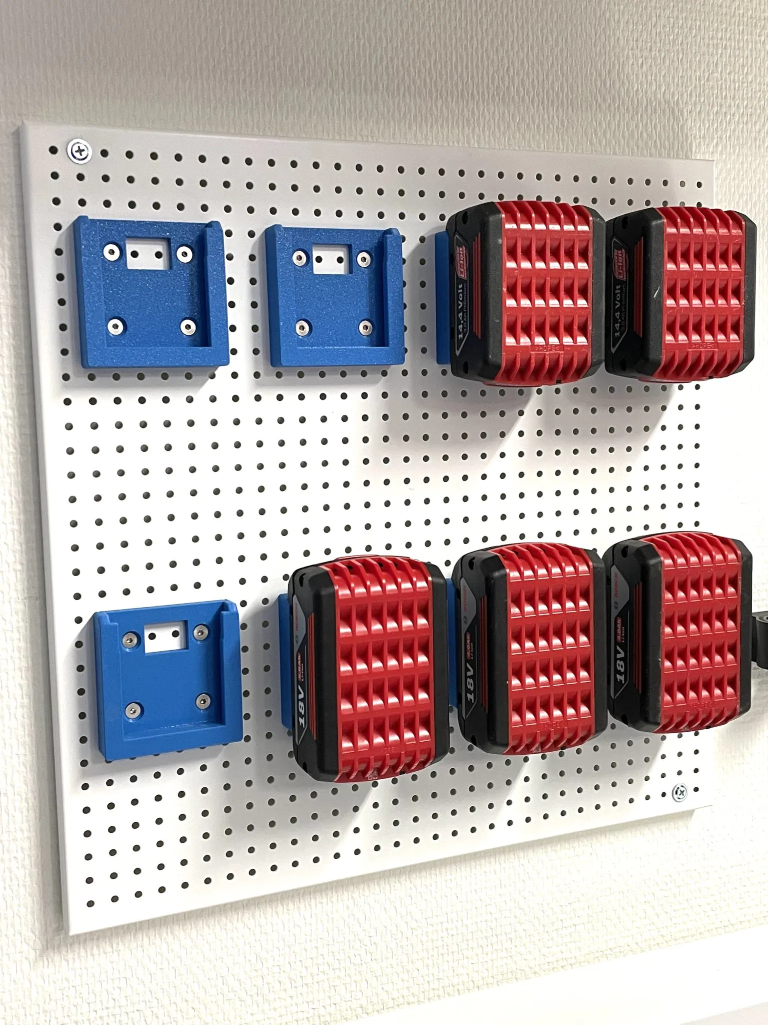 Một giá treo gọn gàng cho pin Bosch 18 volt. Hoàn hảo để tạo ra trật tự và cho pin một nơi chuyên dụng.