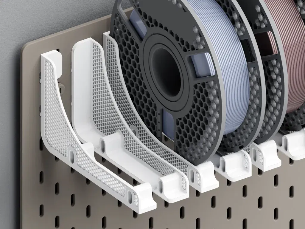 Bộ giá đỡ này cho các cuộn filament có thể được gắn vào bảng ghim SKADIS phổ biến của IKEA. Để giữ một cuộn, luôn có một phần bên trái và một phần bên phải thuộc về nhau.
