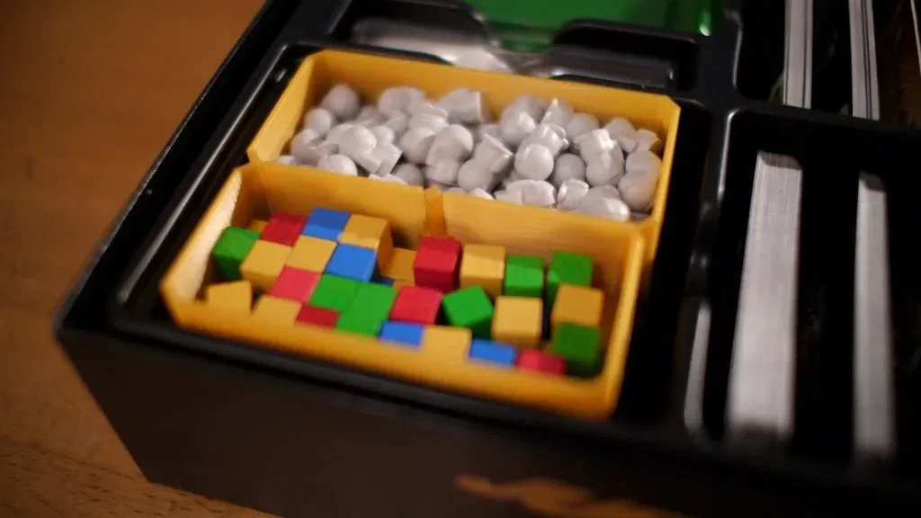 Bạn nhận được 3 hộp, một thanh trung tâm và một nắp cho trò chơi board game 'Galaxy Trucker Anniversary Edition'. Các hộp chứa tất cả các tín dụng, viên đá năng lượng, các mảnh tàu khởi đầu, phi hành gia và hàng hóa có trong phiên bản Kỷ niệm của trò chơi. Tệp để in: ("one", "two", "three", "stick", "lid"). Bạn cũng có thể sử dụng "one__alternativeNoHoles" nếu bạn muốn một giá đỡ đồng xu không có lỗ. Bạn cũng nhận được một Hộp nhỏ (chỉ lên đến cấp độ 2), với một thanh ngắn hơn và một nắp thứ hai. Tệp để in: ("one", "two", "SmallBox_stick", "SmallBox_lid") Tất cả các hộp và nắp được xếp chồng lên nhau bằng một thanh trung tâm nằm trong hộp đầu tiên. Nó được in riêng biệt vì lý do ổn định. Nếu bạn muốn lấy các hộp ra khỏi trò chơi, bạn chỉ cần kéo vào thanh trung tâm này và tất cả sẽ ra ngoài một lần. Các tín dụng rất dễ truy cập và được sắp xếp theo giá trị. Các hộp khác thì chung chung hơn nhưng rất phù hợp cho các viên đá năng lượng, phi hành gia và khối hàng hóa. Chỉ cần đặt các hộp cạnh nhau và bạn có thể bắt đầu trò chơi của mình. Chúc bạn vui vẻ! Xin vui lòng chia sẻ các bản in của bạn nếu có thể :) #### Cập nhật Tháng 10 năm 2023: Đã bao gồm một thanh có độ lắc ít hơn, nên sẽ giữ chặt hơn. Tệp: gtb_stick_with_less_wiggle.stl Cảm ơn vaxxi vì ý tưởng! ### Hướng dẫn in In tất cả các phần. Đặt thanh vào hộp đầu tiên có lỗ: Đặt đầu nhỏ hơn vào lỗ giữa ở đáy của hộp. Các hộp khác được căn giữa trên thanh đó.