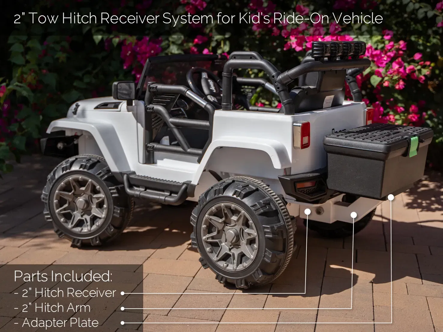 - Tính tương thích của bộ nhận: Bộ nhận kéo được điều chỉnh cao cho mẫu xe điện của con trai chúng tôi - chiếc xe/truck Costzon “giống Jeep”.