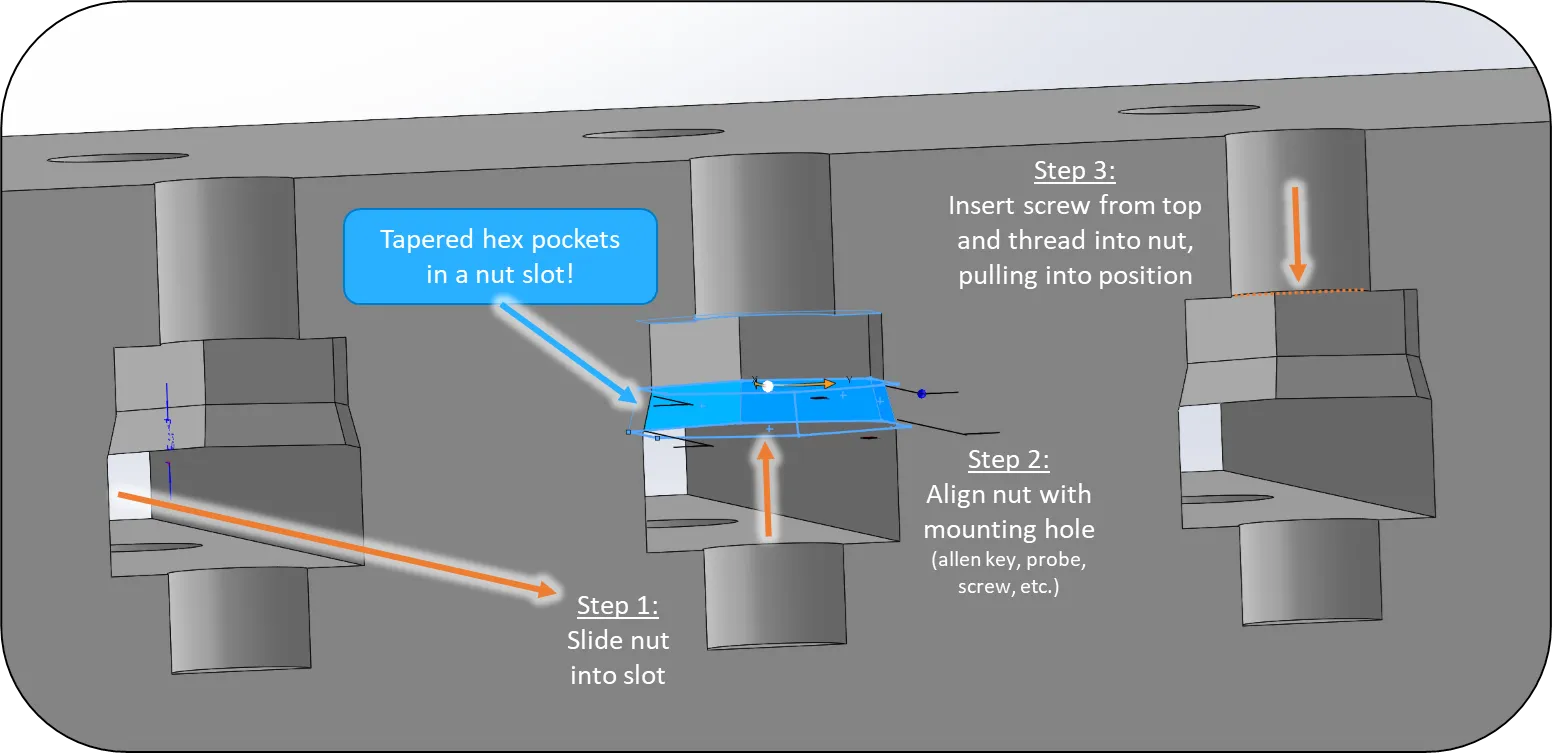 - Chèn các đai ốc M3 (còn gọi là nut-serts) vào một kênh ở cuối bộ phận.