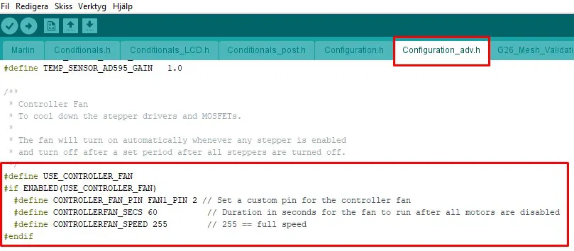 Tôi khuyên bạn nên đặt quạt thổi từ trong ra ngoài và lắp một bộ lọc ở phía trước bên trong để ngăn bụi lọt vào bo mạch điều khiển. Quạt cần là loại 12V và kết nối với PIN 2 trên bo mạch. Tôi chưa thử nghiệm kỹ lưỡng điều này, nhưng sau khi lắp quạt, bạn cần thay đổi mã như một trong những hình ảnh hiển thị trong "configuration_adv.h" khoảng dòng 184.