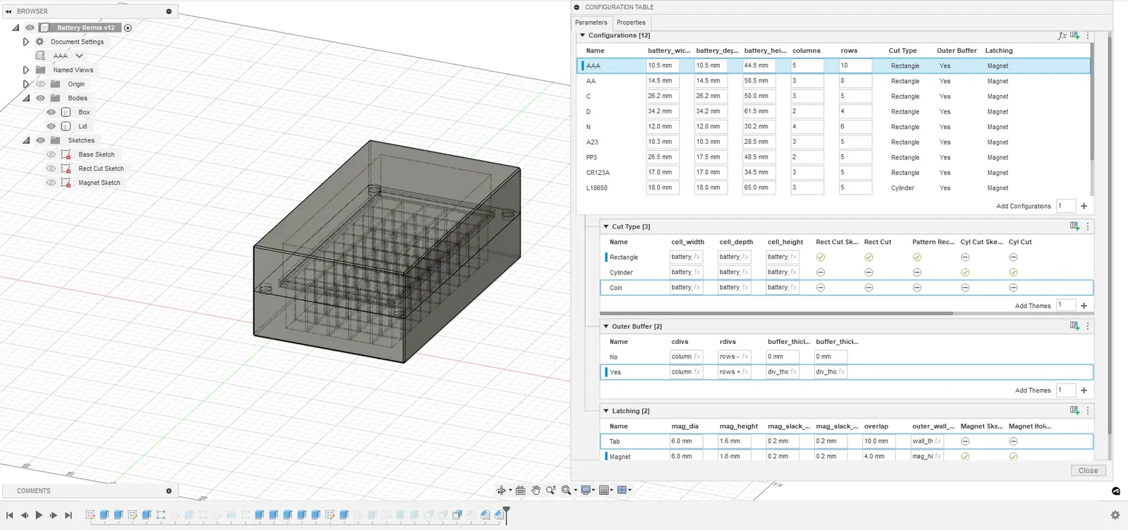 Tôi đã theo các kỹ thuật mà Duncan sử dụng trong thiết kế ban đầu của anh ấy cùng với việc trích xuất bất kỳ giá trị không tham số nào vào cấu hình và tham số người dùng. Tôi đã hợp nhất tất cả các loại pin như là các cấu hình trong một tệp thiết kế Fusion360 duy nhất.