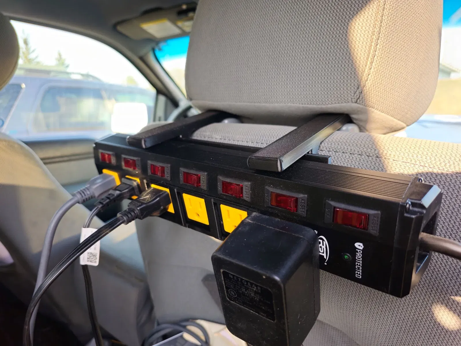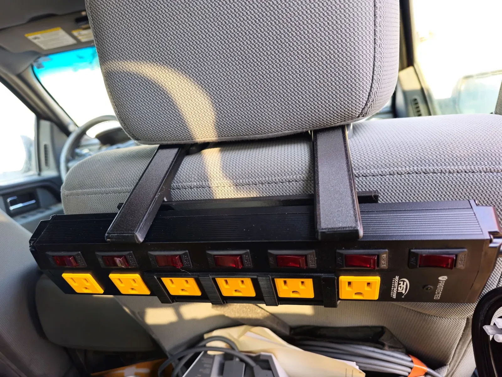 Bộ giá đỡ và lồng này sẽ giữ cho dải nguồn 6 ổ cắm gắn liền với mặt sau của ghế hành khách. Nó trượt quanh các trụ dọc cho tựa đầu và giữ cho dây nguồn và bộ chuyển đổi của bạn không chạm sàn và tránh được nguy hiểm.