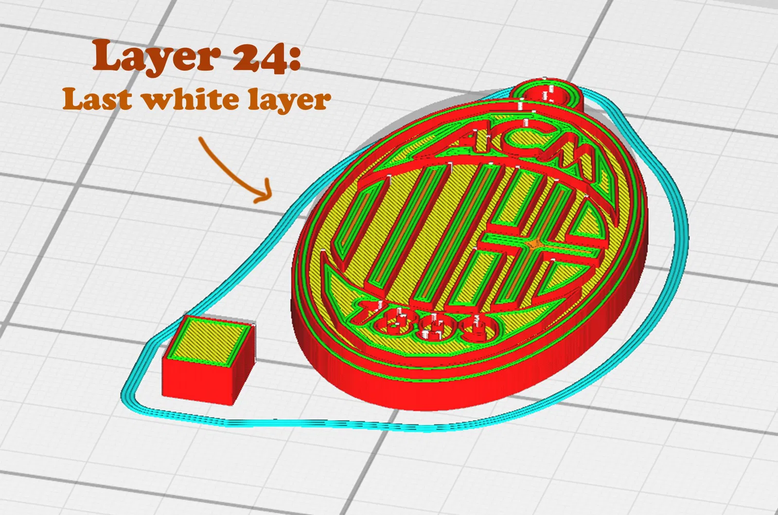 - Lớp thứ 24 (chiều cao = 4.8mm) là lớp cuối cùng của màu trắng, sau đó bạn phải thay đổi filament và chèn màu đỏ;