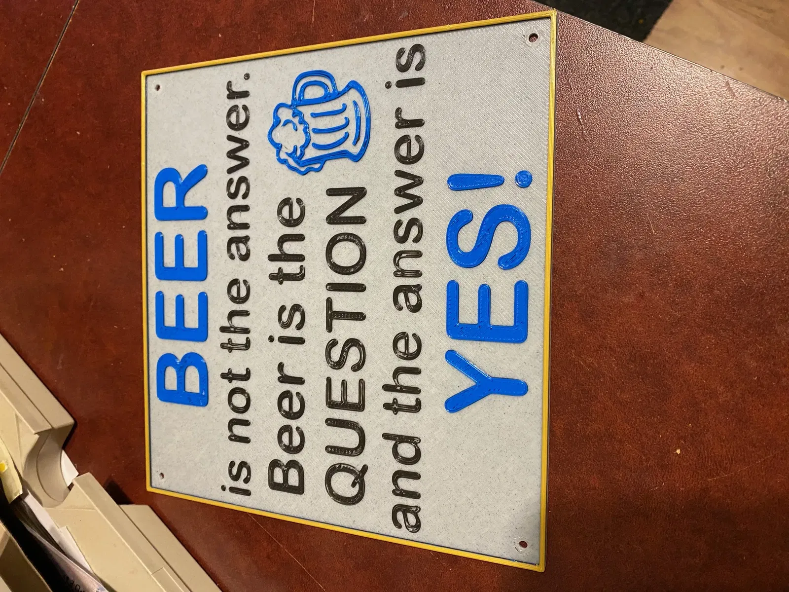 Bạn thân yêu thích biển hiệu cho hang động của mình nhưng muốn thay đổi một chút phong cách. Đã nâng cao văn bản để nhấn mạnh và thêm một viền tròn nổi. Tôi đã làm điều đó với một vòi phun .6 nhưng phần điền chữ không được tốt lắm (nên thay đổi độ phân giải ở đó hoặc sử dụng vòi phun .4). Anh ấy không quan tâm :)) 4 màu - một vòi phun đơn.