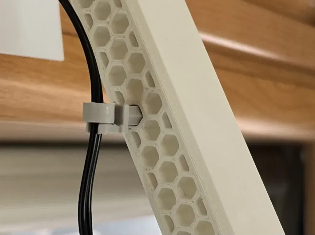 Tôi cần một giá đỡ nhỏ để giữ một dây cáp nguồn (mỏng) bên cạnh một cánh tay hỗ trợ thiết bị. Hóa ra việc này rất dễ dàng bằng cách sử dụng cơ chế khóa được, in tại chỗ của @itsaMeWolf và một chốt lục giác đơn giản. Quan trọng: - Chốt lục giác phù hợp với cánh tay arm-small-hex, không phải là loại tương thích với tổ ong.