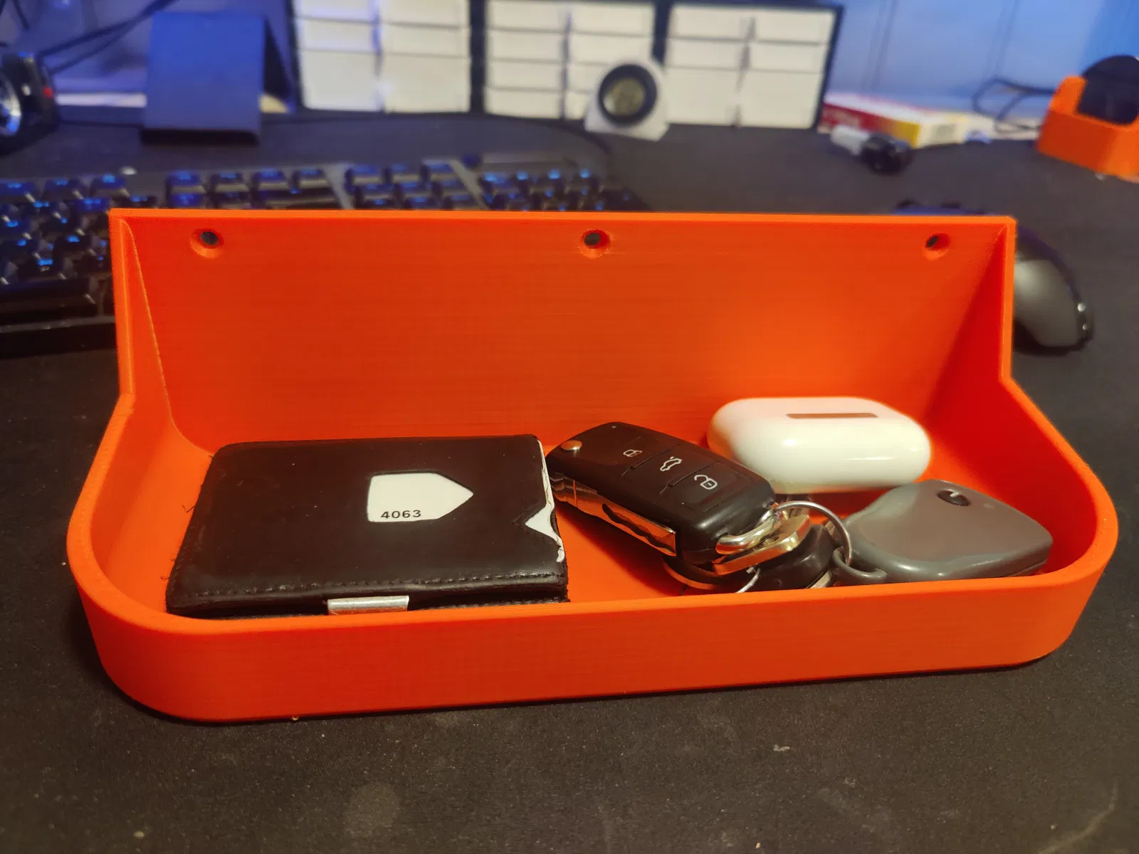 Chỉnh sửa: Đã làm phiên bản 2 với các góc bo tròn và fillet bên trong để dễ lấy đồ hơn. Đã in và gắn thành kệ "chìa khóa/ví/airpods" trong gara.