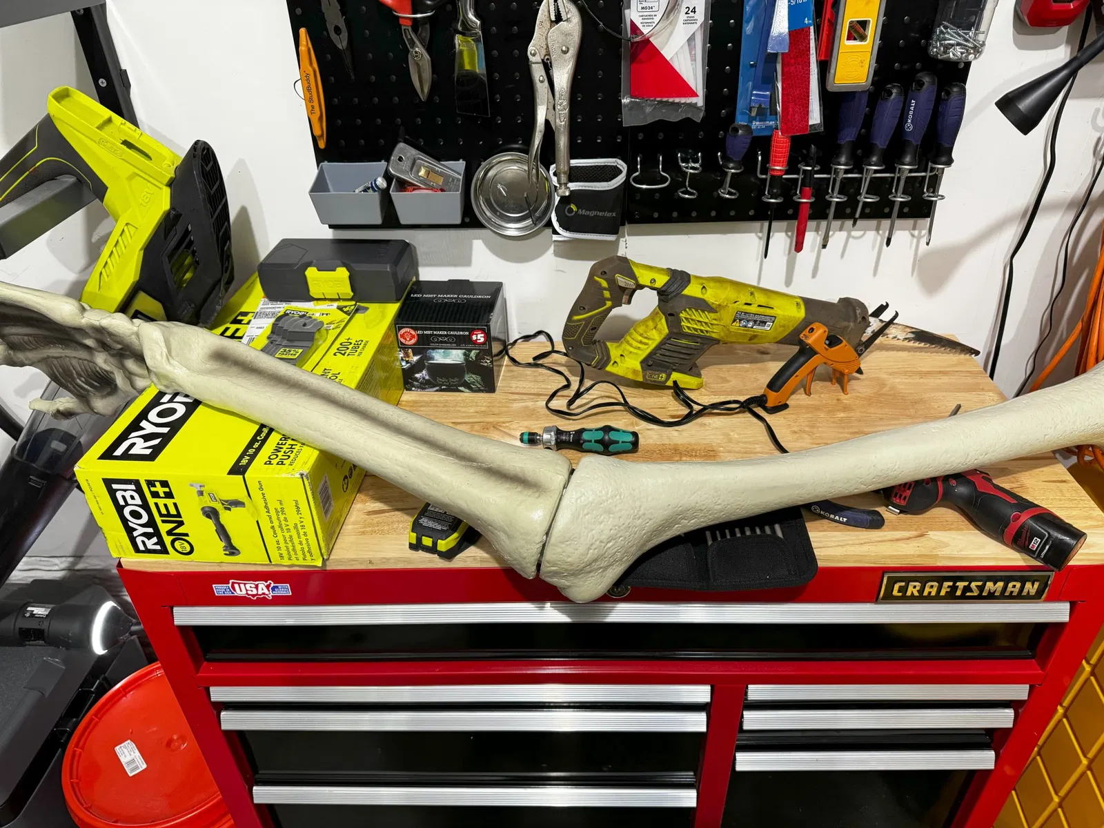 Một cơn bão gió năm ngoái đã khiến bộ xương của tôi bị rơi xuống, và một giá đỡ cẳng tay là một trong những thiệt hại. Tôi đã tạo ra một phiên bản có thể in 3D để có thể dựng lại anh ấy vào năm nay!