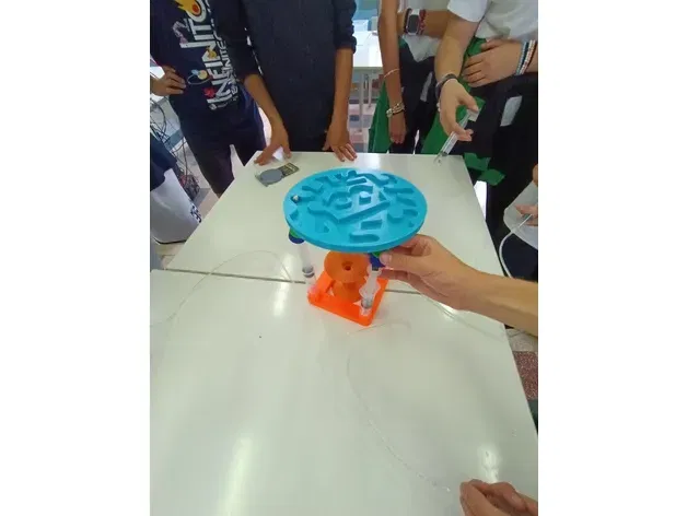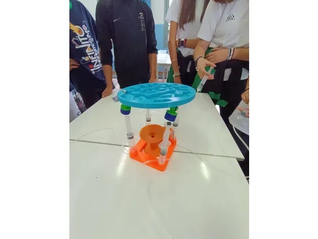 Một mê cung di chuyển được đặt trên 4 ống tiêm 20ml làm piston. Cần có 4 người và làm việc theo nhóm để đưa viên bi vào lỗ ở giữa. Nó là một phần của Phòng Thí Nghiệm Escape School được thực hiện cho Bergamoscienza 2023