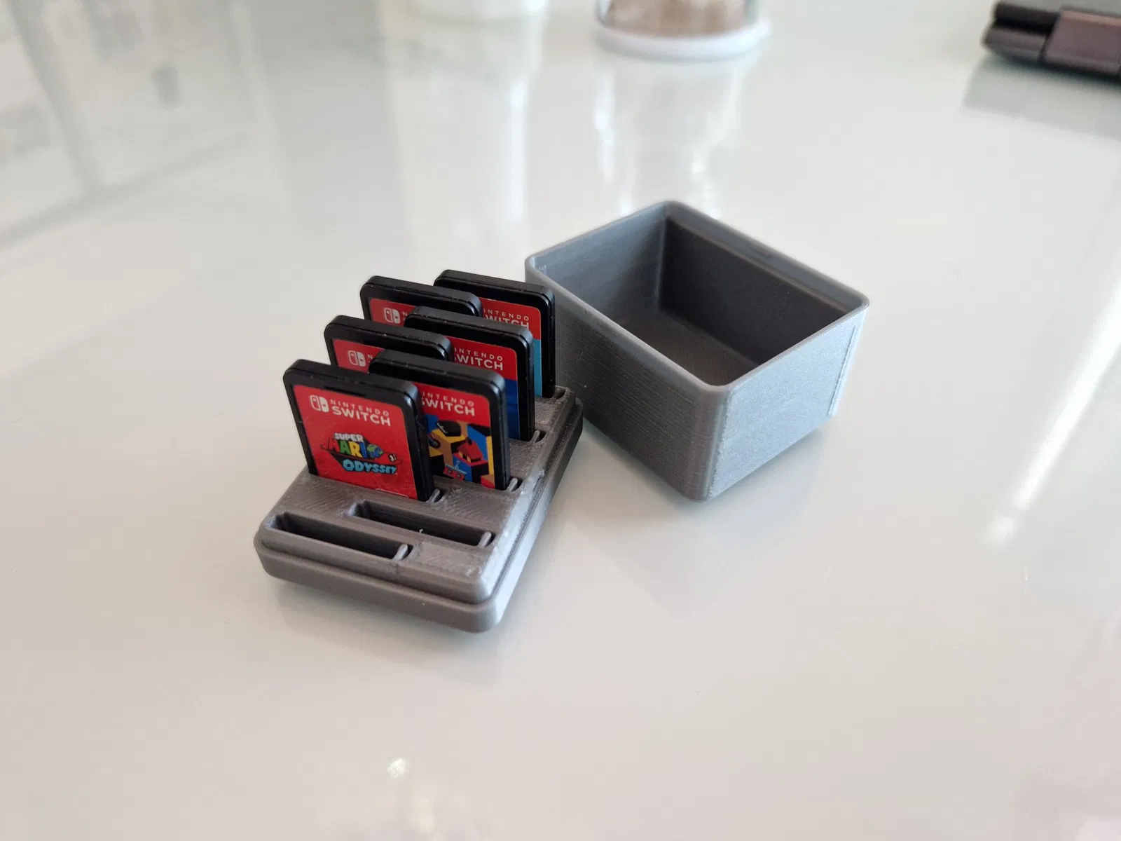 Khoảng cách khá chật trong mẫu này nên bạn có thể cần điều chỉnh một số cài đặt in để các khe hoạt động tốt cho bạn. Nếu bạn muốn kiểm tra cài đặt in của mình và xác minh rằng thiết kế khe hoạt động cho bạn mà không cần in toàn bộ mô hình, hãy in slot-tolerance-test.3mf trước, đó là một mẫu thử nghiệm tối thiểu của một khe cho một cartridge Switch đơn. Cơ sở hoạt động độc lập (nếu bạn không muốn in nắp/trên). Tôi đã thử in cái này từ PLA với chiều cao lớp 0.2 mm và nó hoạt động tốt. ### Muốn tạo một bản remix? Nếu bạn muốn tạo thiết kế của riêng mình dựa trên cơ chế lắp ghép của tôi cho cartridge trò chơi, hãy thoải mái sử dụng mô hình slot-cad-cut-tool.3mf như một công cụ cắt trong CAD để cắt ra cơ chế khe từ một khối rắn. Nếu bạn làm như vậy, tôi rất thích nếu bạn có thể đăng nó như một bản remix. ### Cảm hứng Thiết kế này được lấy cảm hứng từ Nintendo Switch Game Holder (bởi TinyBoat) nhưng vì cái đó hơi lỏng lẻo (ít nhất là trên máy in của tôi với các cài đặt của tôi) và tôi có một số ý tưởng cho thiết kế cải tiến, tôi đã tạo ra thiết kế tương tự của riêng mình từ đầu trong Fusion 360.