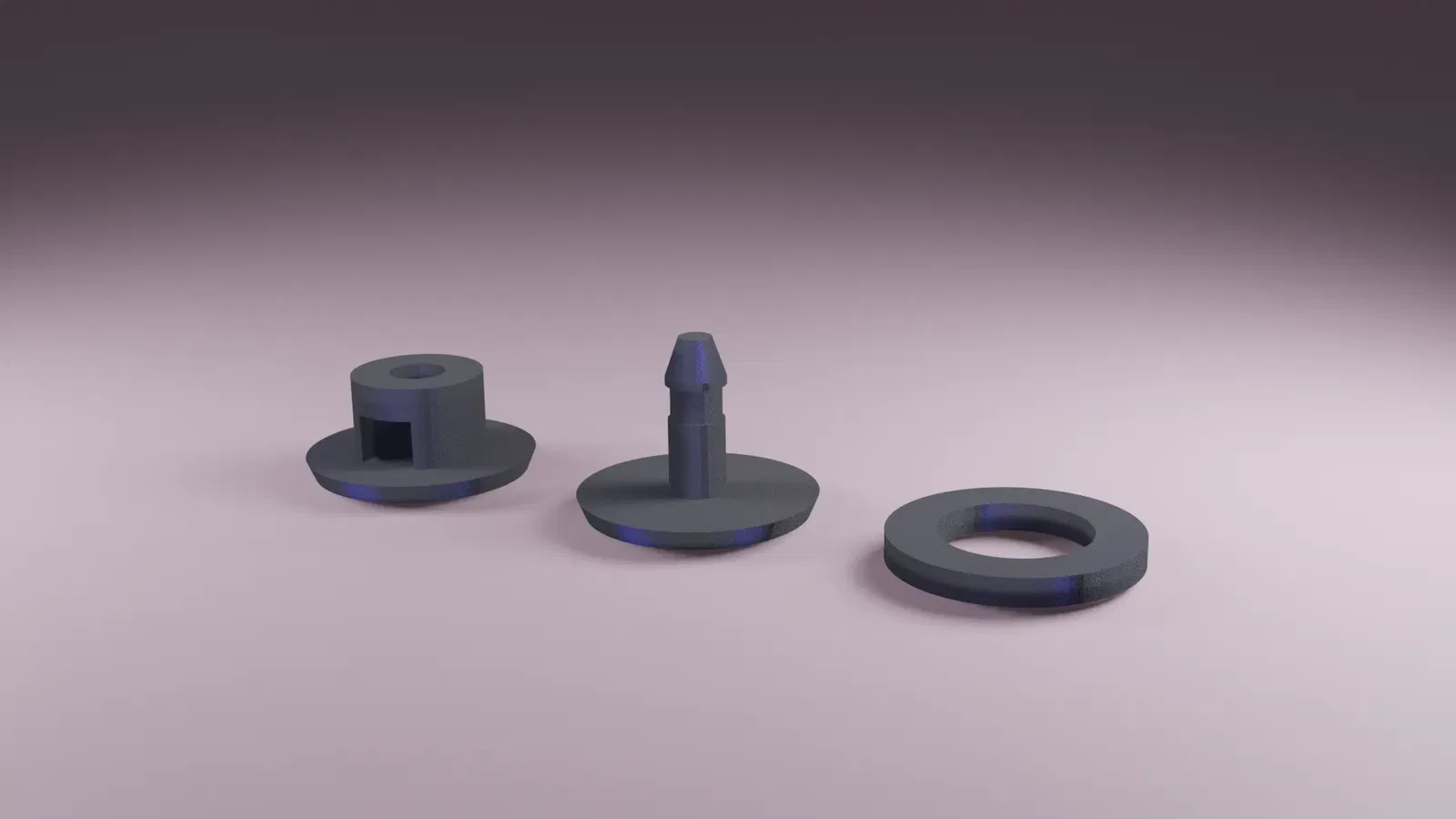 Các mảnh của đinh tán gốc mà tôi có thể tìm thấy bao gồm một miếng đệm và một đinh tán có khớp bóng. Khớp này rất quan trọng vì nó cho phép dây đeo và đinh tán xoay mà không gây áp lực không cần thiết lên đinh tán. Tôi đã tạo một bản sao của gốc với một khớp bóng, đây là cài đặt mặc định cho tệp OpenSCAD. Tuy nhiên, tôi cũng đã bao gồm một kiểu đinh tán sẽ không xoay khi kết nối trong trường hợp bạn thấy điều đó phù hợp hơn với nhu cầu cụ thể của bạn.