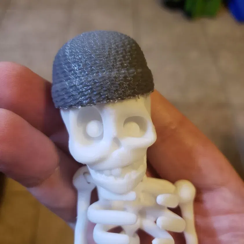 Tôi đã làm chiếc mũ len này cho bộ xương flexi factory, đây là một bản in nhanh và dễ dàng, và là cách thú vị để trang trí cho bộ xương của bạn. Tôi đã in phẳng trên một lớp đế với các hỗ trợ thông thường, hỗ trợ cây làm việc tốt hơn. Để đặt lên đầu anh ấy, hãy tìm phần lõm nhỏ trên mũ đi về bên phải của mắt trái anh ấy. Căn chỉnh phần này và ấn phần phía sau xuống, nó sẽ giữ chặt vào vị trí nhờ ma sát khá tốt để có thể đeo và tháo ra tùy thuộc vào thời tiết.