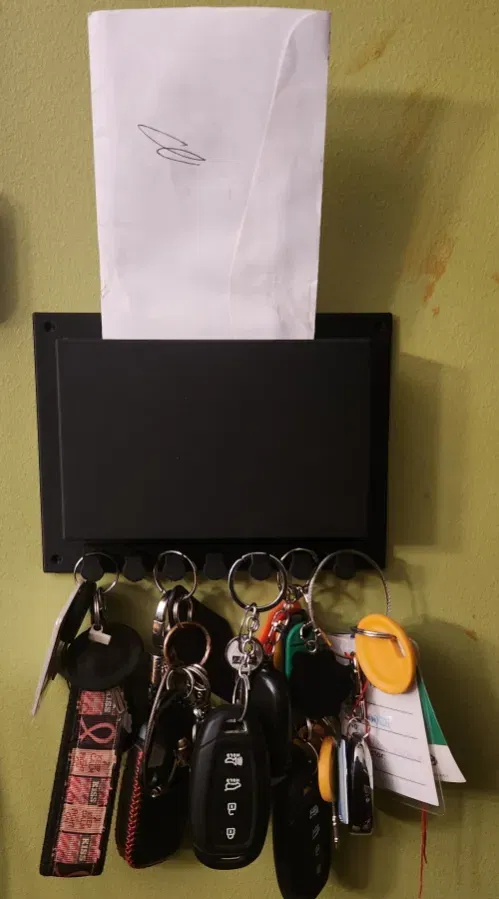 Tôi đã quyết định tạo ra một giải pháp cho phép chìa khóa và thư của chúng tôi được đặt ở một chỗ duy nhất. Giải pháp này có thể được gắn lên tường bằng vít (tôi đã bao gồm các lỗ khoan pilot) hoặc bằng băng dính hai mặt (https://www.amazon.com/gp/product/B091DNKSTV/ref=ppx_yo_dt_b_asin_title_o09_s00?ie=UTF8&psc=1)