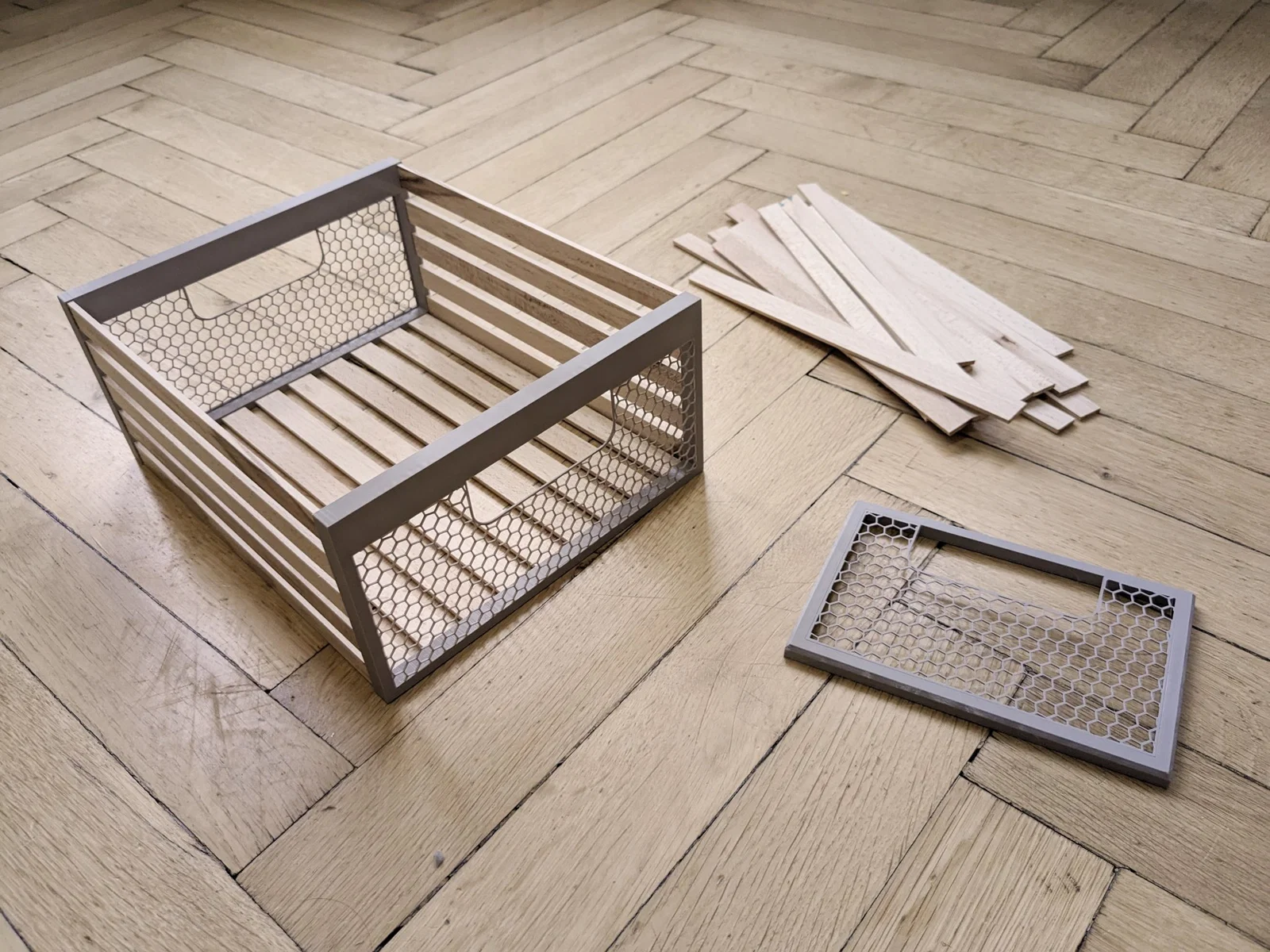 Một chiếc thùng/hộp vận chuyển rẻ và đơn giản được làm từ các thanh gỗ. In bên hông 2 lần và chỉ cần lắp vào số lượng thanh cần thiết.