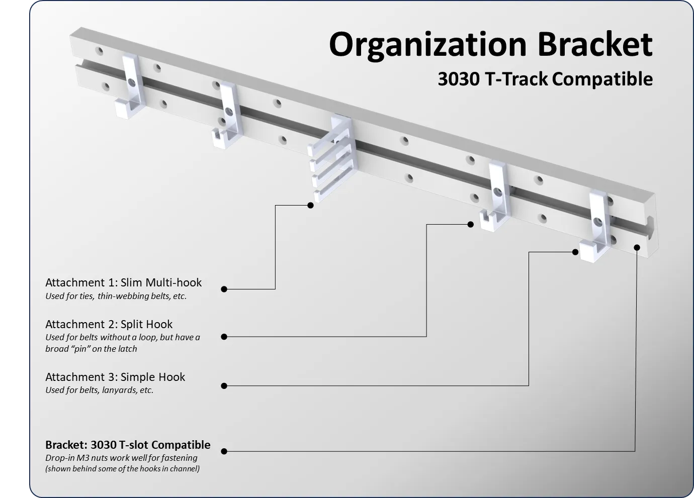 Tủ quần áo đi bộ của chúng tôi có nhiều không gian treo thanh áo, nhưng không có nhiều không gian cho các phụ kiện lạ, thắt lưng, cà vạt, v.v. Tôi muốn xây dựng một hệ thống móc rất gọn gàng, tiêu chuẩn để có thể sử dụng ở những nơi khác hoặc dễ dàng remix trong tương lai nếu muốn, và đơn giản. Đây là một giá đỡ đơn giản, có độ thấp có thể được gắn vào tường bằng băng dính hai mặt (tức là các dải 3M) hoặc qua các vật cố định - các lỗ khoan chìm đã được bao gồm. Phù hợp với các nút t-slot nut-serts từ printables — Tôi đã sử dụng 3030 M3 drop-in nuts từ TC | F3D.com. Tôi đã in bằng PETG để đảm bảo độ bền và tuổi thọ của các bộ phận. Sự vừa vặn là tốt cho các bản in của tôi, nhưng nếu nó chặt cho bản in của bạn, bạn có thể mài/giũa hoặc điều chỉnh qua các tệp CAD đã cung cấp. Mẹo: Tôi đã bao gồm một phần “khối mở rộng”. Bạn có thể in cái đó để sử dụng như một hướng dẫn để đặt hai giá đỡ cạnh nhau và giữ chúng trong sự căn chỉnh tạm thời cho đến khi chúng được gắn.