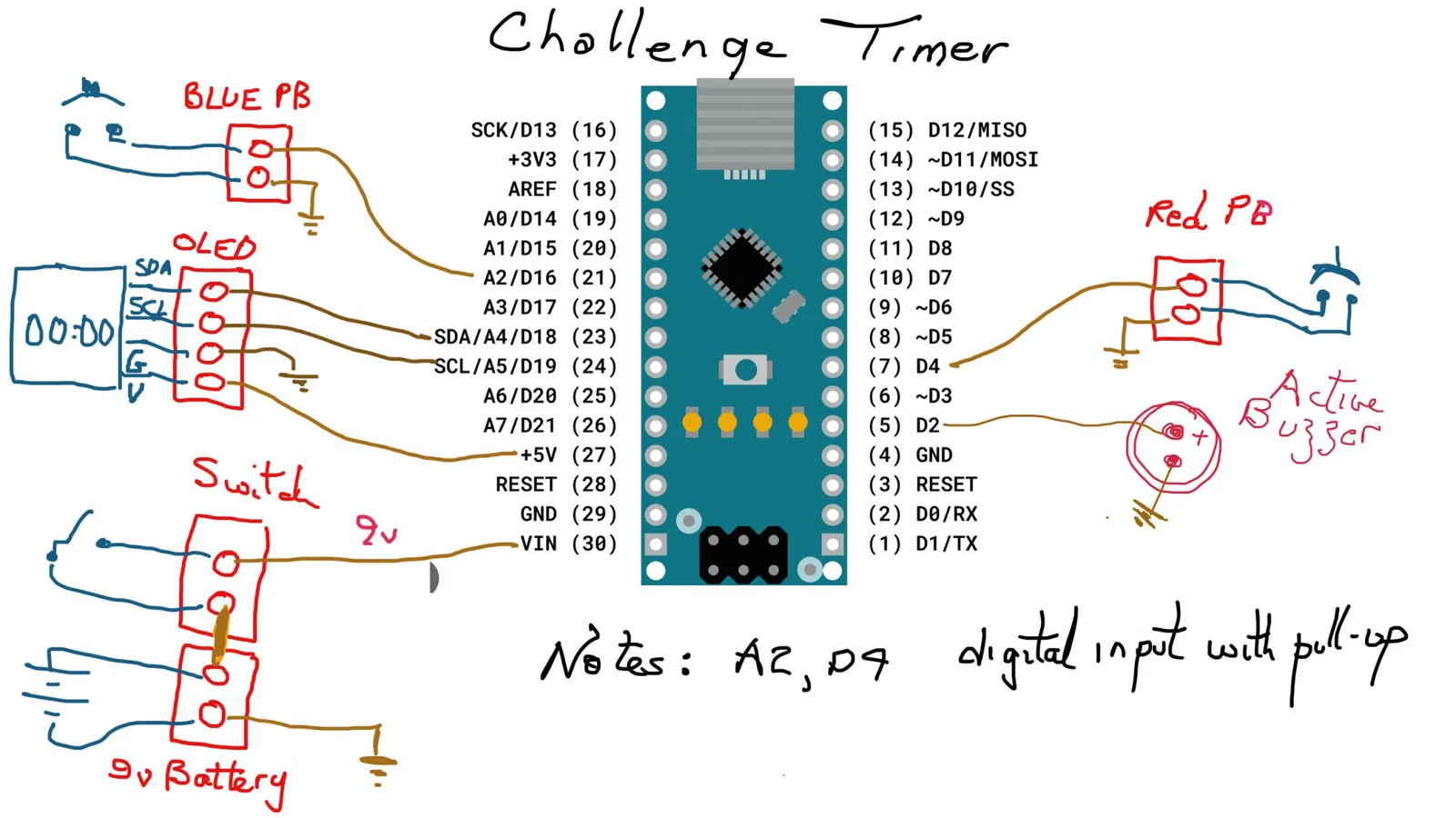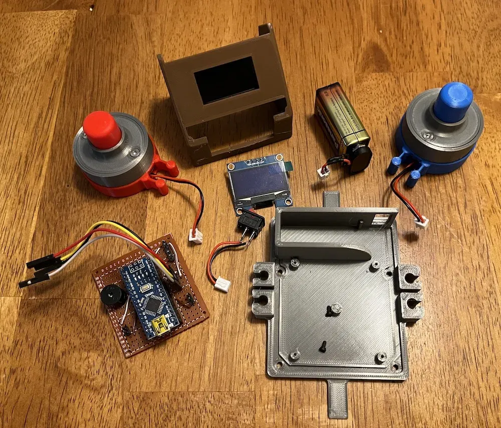 Bộ hẹn giờ này được thiết kế ban đầu để sử dụng với các mô hình Skid Steer điều khiển từ xa nhằm cho phép chúng bắt đầu/dừng hẹn giờ khi hoàn thành các sự kiện thử thách. Tuy nhiên, các linh kiện là mô-đun. Bạn có thể thêm một hoặc hai nút nhấn. Mã nguồn rất đơn giản và có thể dễ dàng tùy chỉnh bởi người dùng cho nhiều mục đích khác nhau. Trái tim của thiết bị là một Arduino Nano v3 (bản sao) và một màn hình OLED 1,3". Mỗi cái có sẵn với giá dưới 5 đô la từ AliExpress hoặc các nhà cung cấp khác.