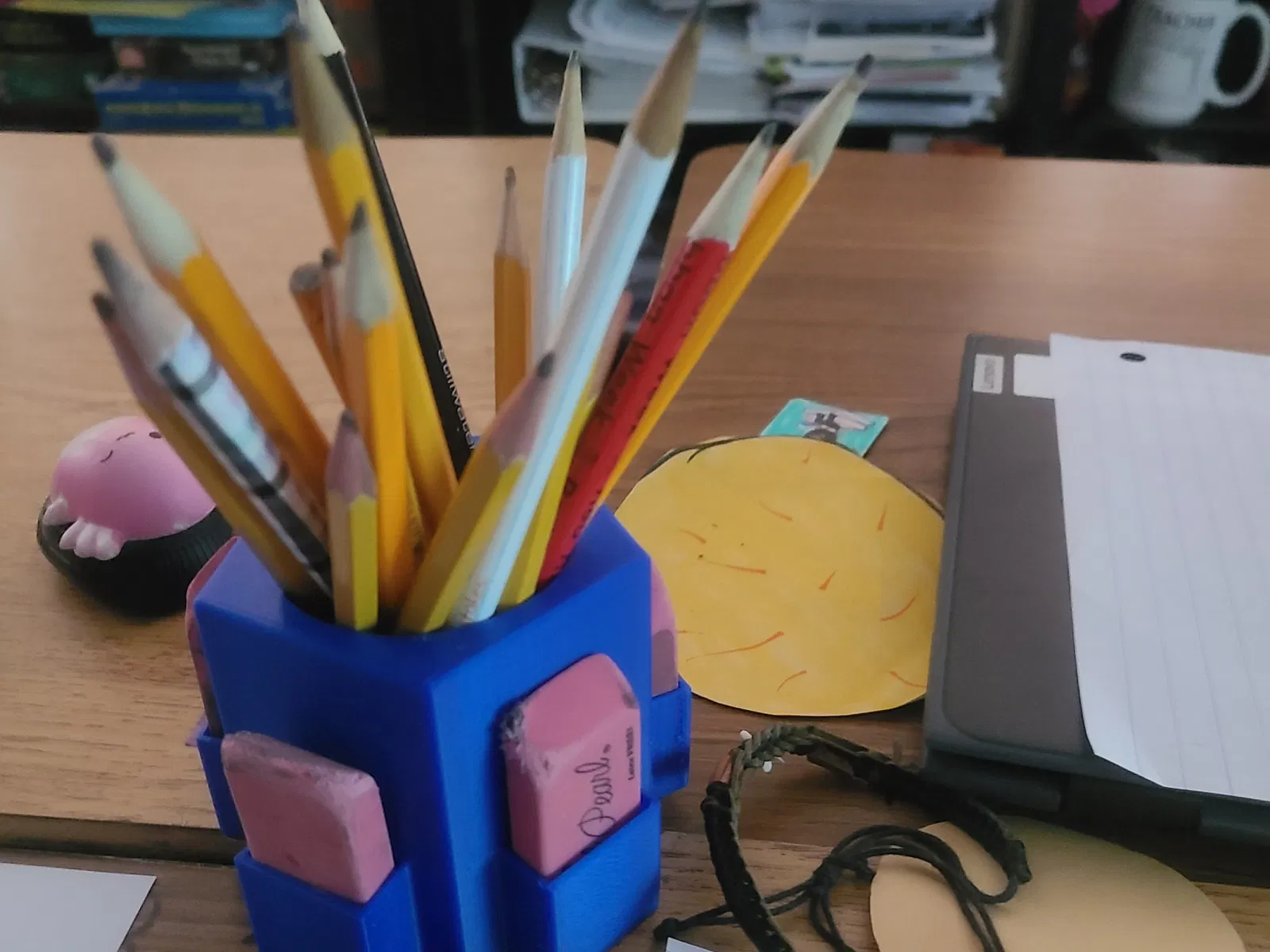 Đây là một giá đỡ bút chì cũng có năm giá đỡ cho cục tẩy màu hồng ở bên ngoài. Tôi đã in chúng với các màu khác nhau cho mỗi nhóm của mình. Điều này giúp dễ dàng nhìn thấy nơi bút chì của tôi đang biến mất. Các học sinh rất thích chúng và thích rằng chúng được làm cho họ.